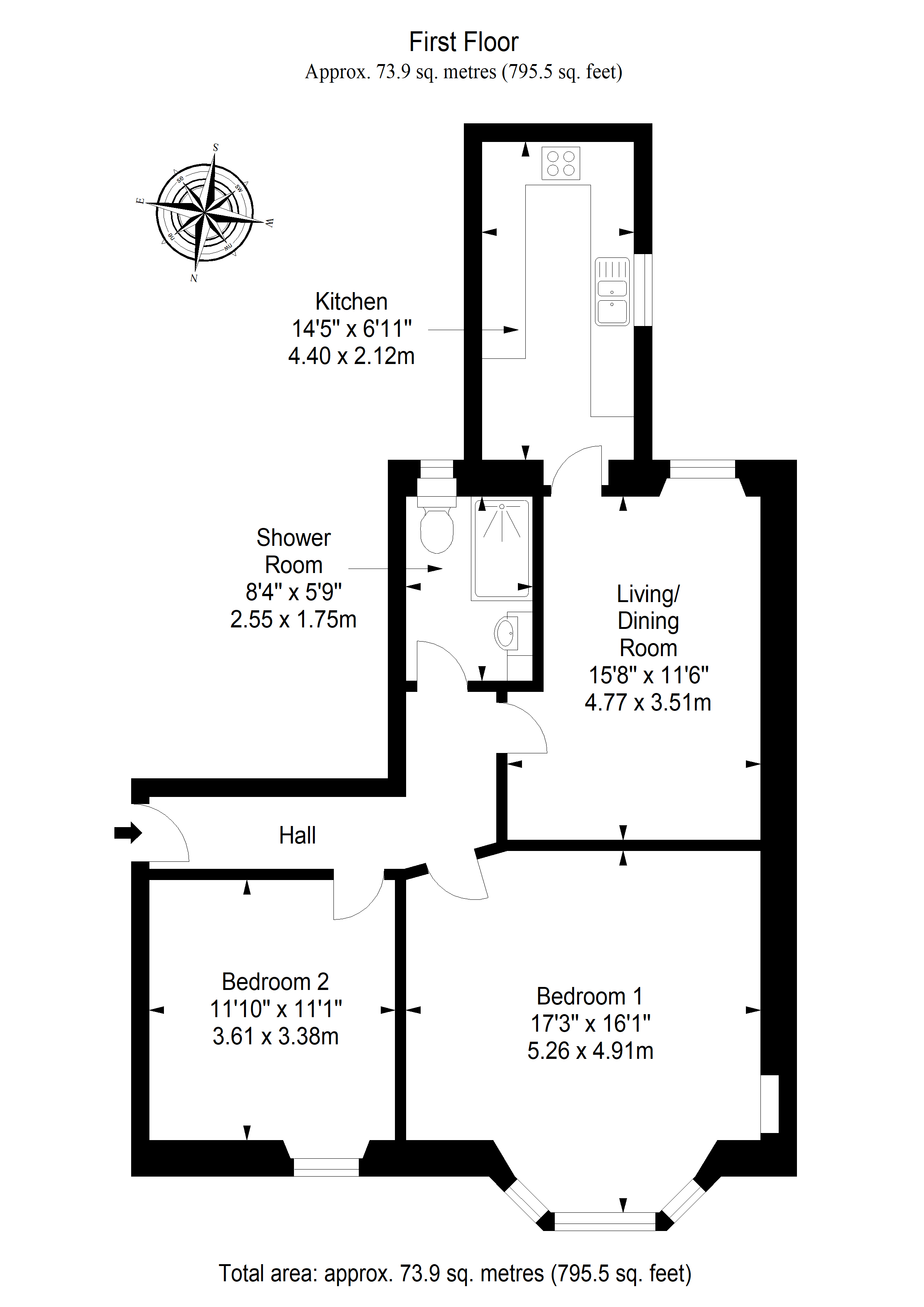 The entrance hallway leads to a spacious lounge and a fitted kitchen complete with integrated oven, hob and hood, boiler and space for appliances. There are two double bedrooms, the principal with a bay window, and a modern shower room featuring a shower cubicle, vanity storage and WC. Additional storage is provided via a shared attic space above the stairwell, while further shared drying facilities are located externally.