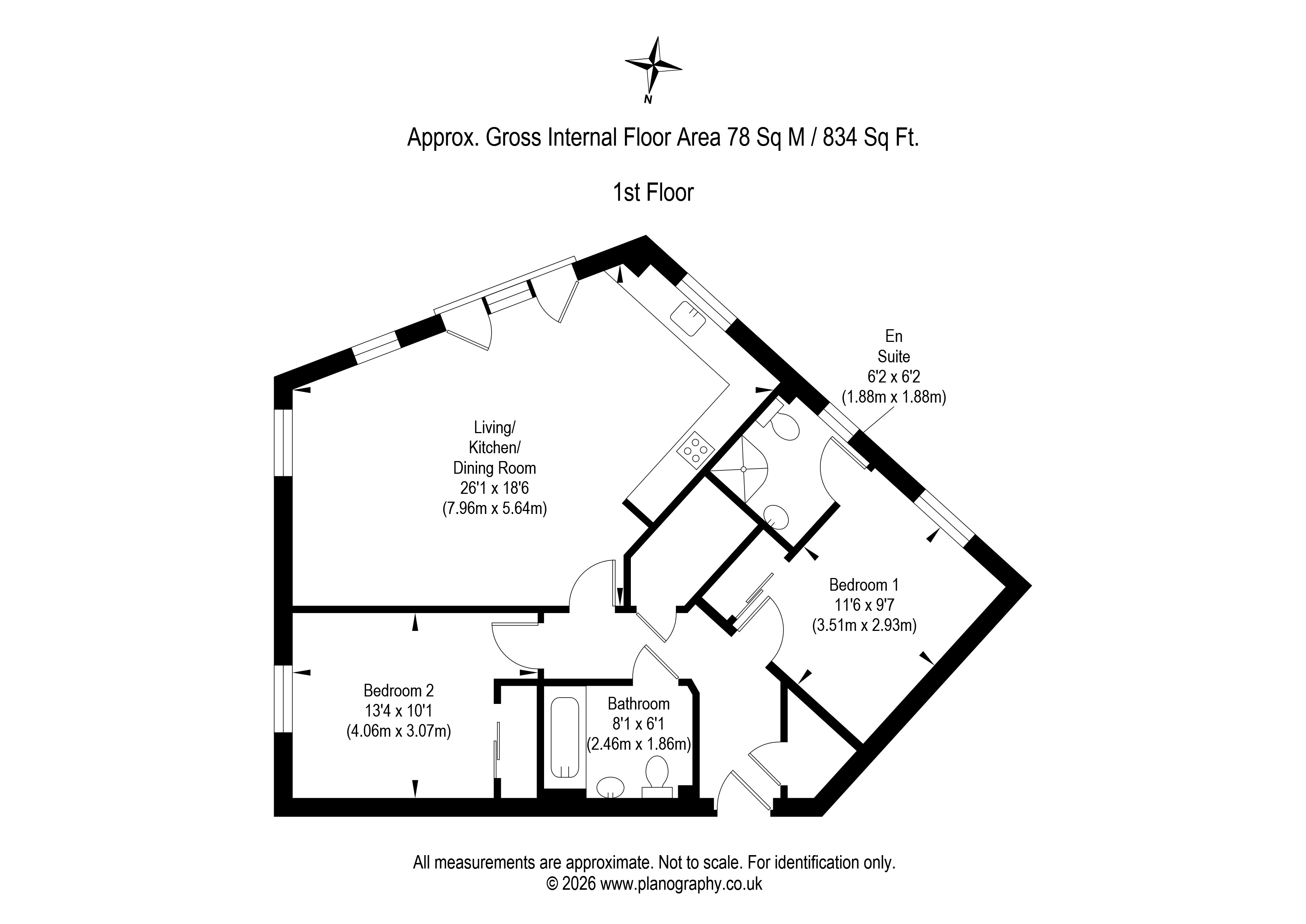 The property comprises entrance hallway, an impressive open-plan living/kitchen/dining room with sunny aspect, two generous double bedrooms, including a principal bedroom with en-suite, and a separate bathroom. The layout maximises the available floor area, with particularly notable proportions within the main living space. The property further benefits from a convenient location close to local amenities, transport links, healthcare facilities and the school/nursery is just 2 minutes away. Additional benefits include gas central heating, double glazing, and residents’ parking with early viewing highly recommended.