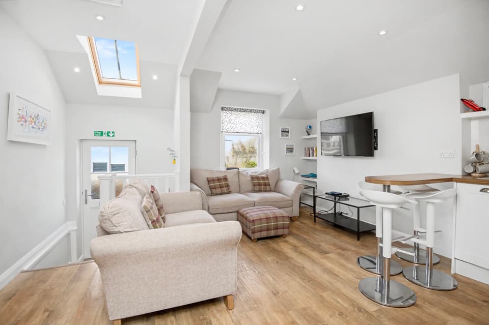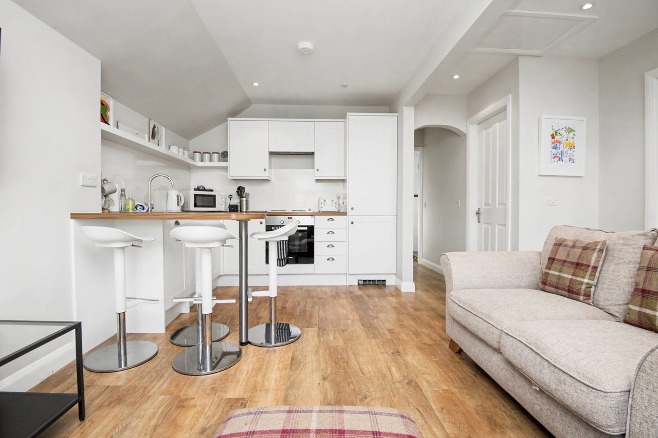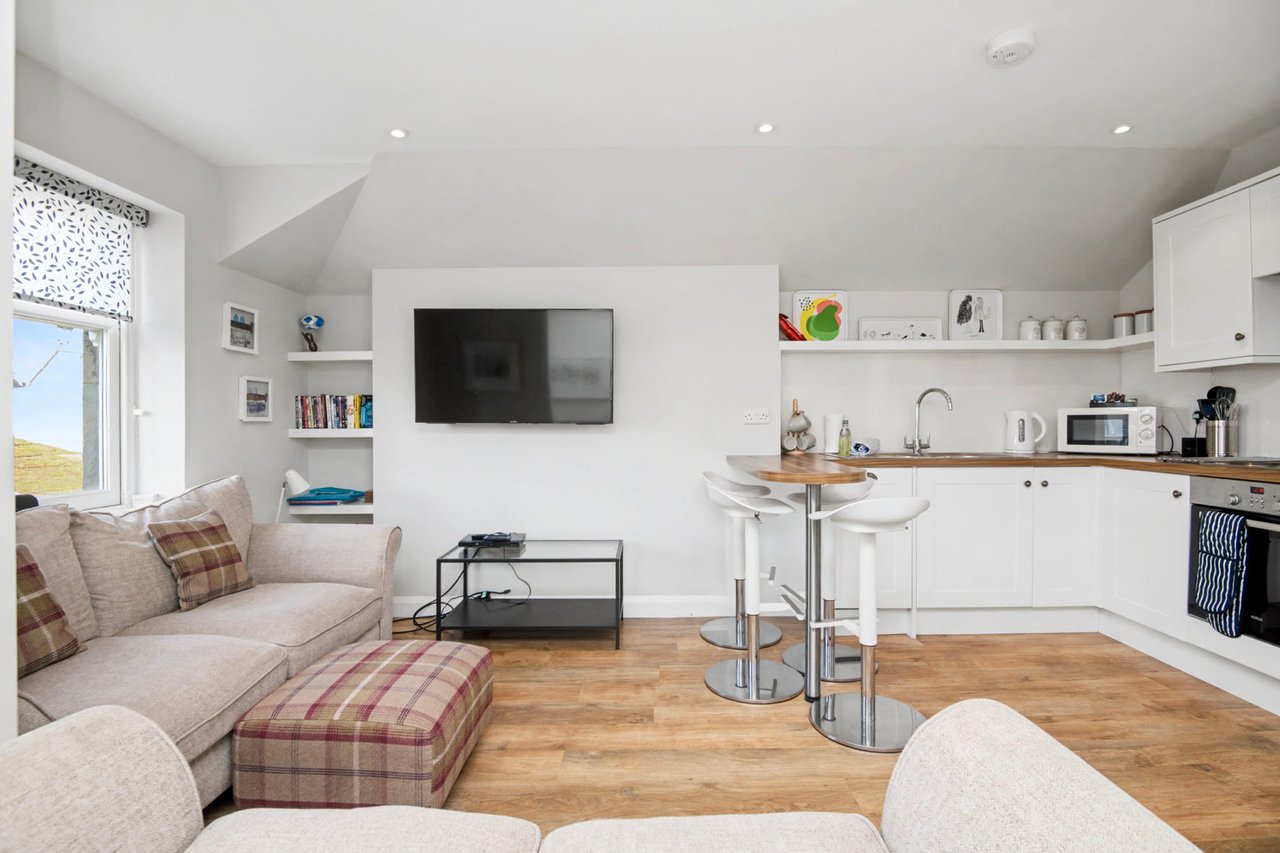 Set on the first floor of a traditional sea front residence, with direct shore access and allocated parking, this two-bedroom main- door flat enjoys a prime position in the charming coastal town of Elie and Earlsferry. Much loved by locals and visitors alike, the area is renowned for its excellent amenities, Blue Flag sandy beach, and breathtaking setting in the picturesque East Neuk of Fife. The home’s modern interiors enjoy excellent natural light and a tasteful minimalist décor. In addition to two double bedrooms, there is a shower room and a sociable open-plan living room and kitchen, which features a breakfast bar and integrated appliances. Additionally, there is useful external storage. Extras: All fitted flooring, window coverings, and light fittings are included in the sale.