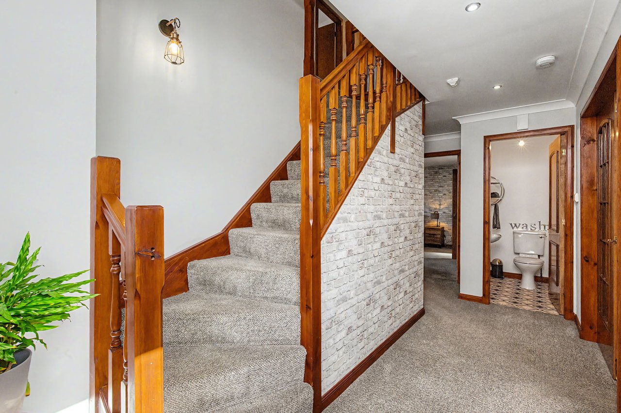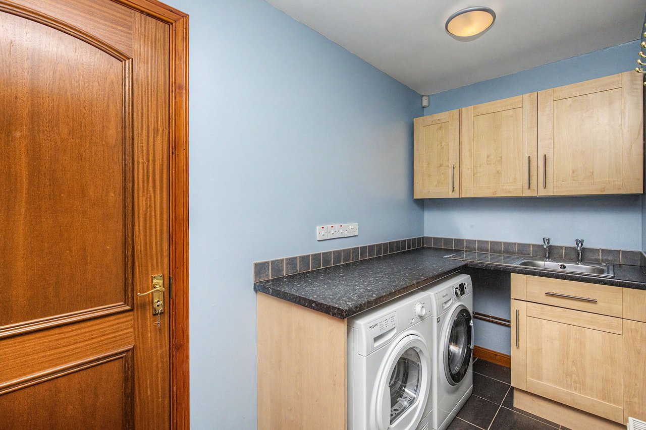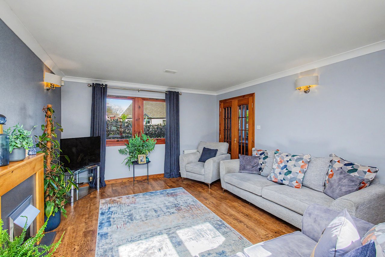 This attractive semi-detached home occupies a corner plot in an established residential setting in Finavon, offering spacious and versatile family accommodation. The property opens with a hall with a storage cupboard and a guest WC, leading to a sunny living room with patio doors, a sitting room, and an open-plan kitchen/dining area with utility room, as well as a comfortable principal bedroom with a built-in mirrored wardrobe and an en-suite shower room. Upstairs, the home features three further bedrooms with storage, an office, and a four-piece bathroom with freestanding tub. Externally, there are private gardens with a deck and seating areas, along with a private driveway and garage. Extras: All fitted floor and window coverings, light fittings, and integrated appliances are included.