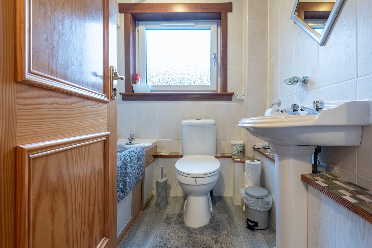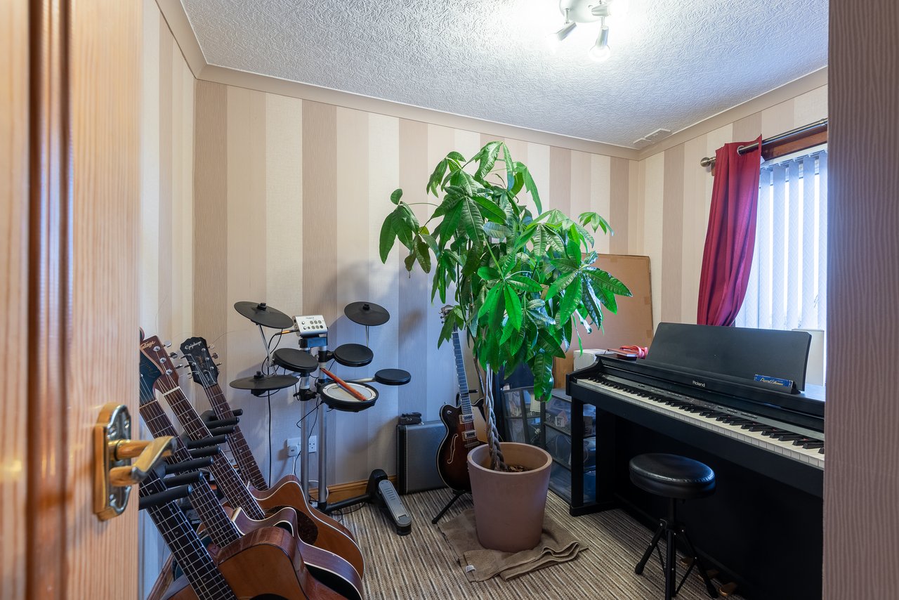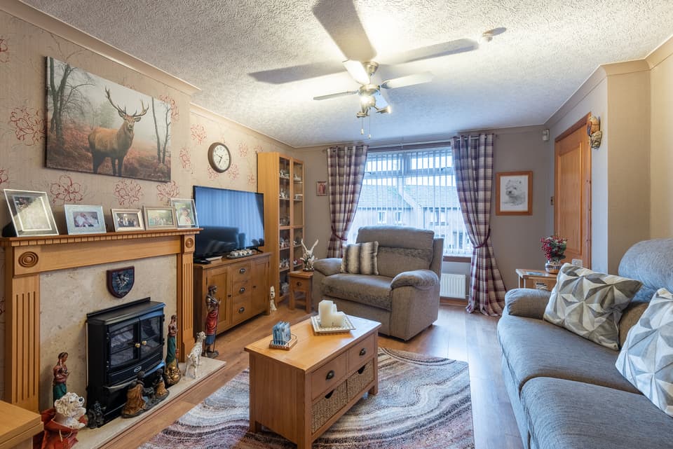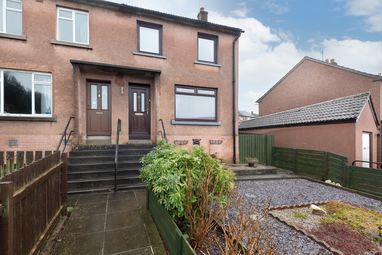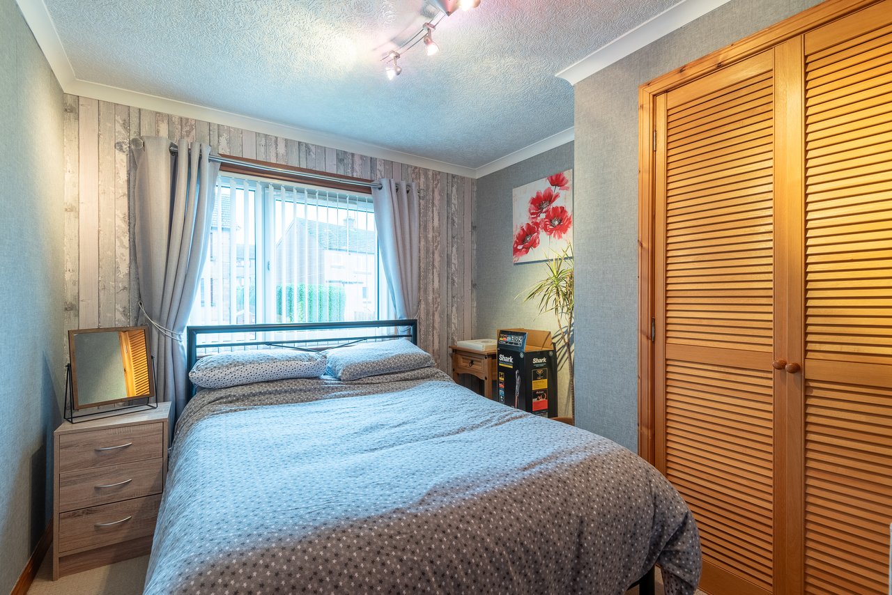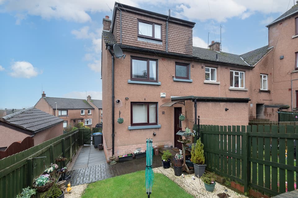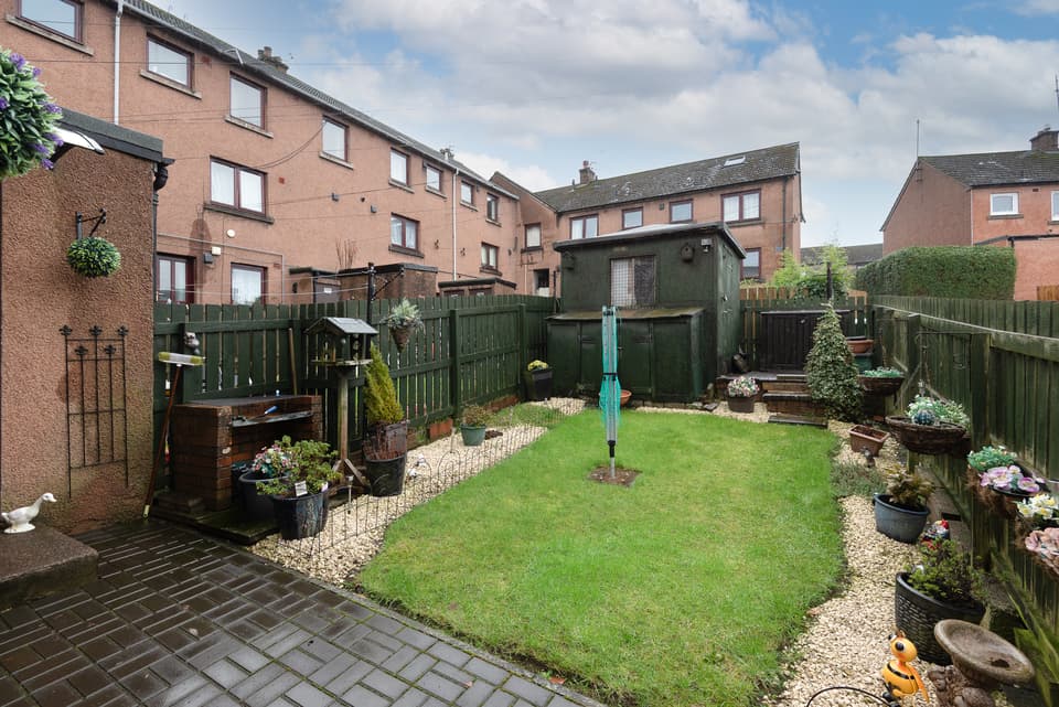 Externally, both the front and rear gardens are laid out for ease of maintenance. The front garden features various shrubs, while the rear garden includes a drying green and timber shed.