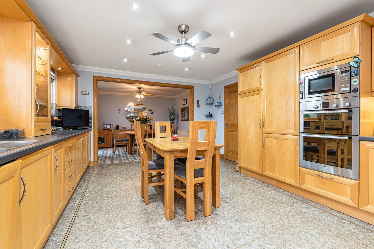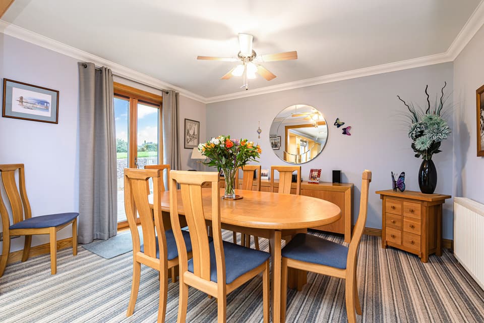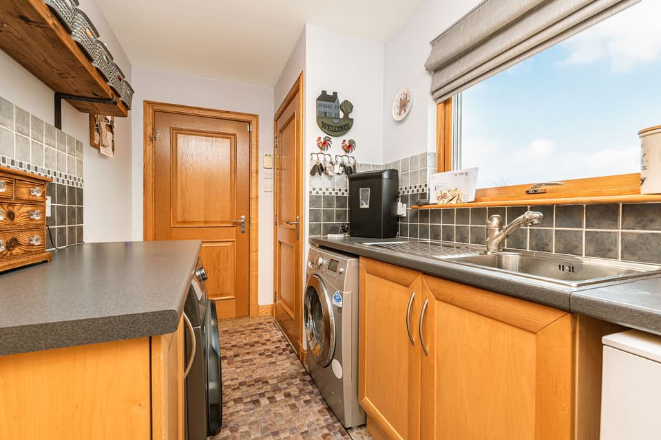 Filled with natural light, the contemporary dining kitchen provides a welcoming setting for breakfasts and casual suppers. Appointed in timeless oak tones, it offers extensive fitted storage, illuminated worktops, and high-quality integrated appliances, including a double waist-height oven, a microwave, a fridge freezer, a dishwasher, and a five-ring LPG burner with a feature chimney hood. The adjoining utility room continues the kitchen’s style. It provides additional practicality as a laundry area with a freestanding washing machine and tumble dryer, along with convenient direct access to the garage.