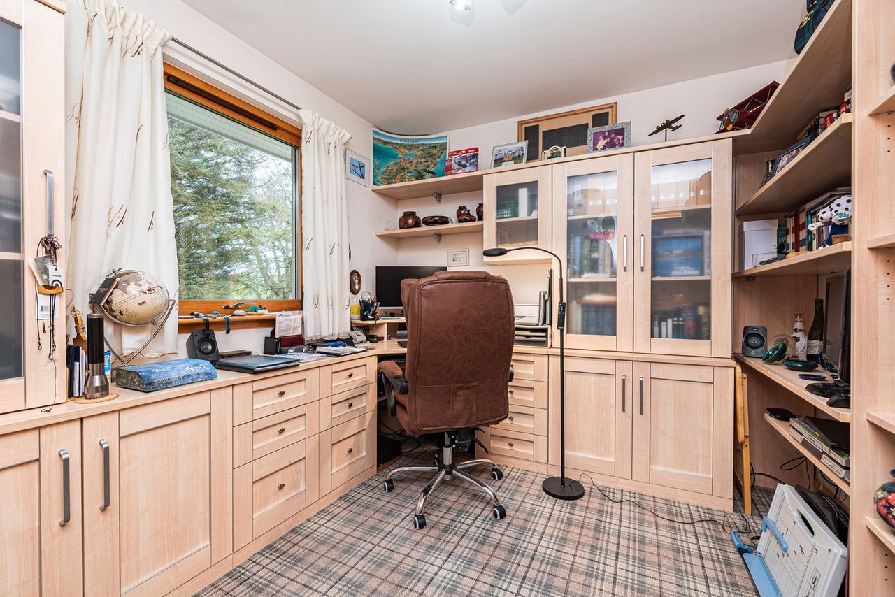 The three remaining double bedrooms offer restful outlooks and comfortable carpeting, two with fitted wardrobes (one dual-aspect), while the fourth bedroom is currently arranged as a quiet home office.
