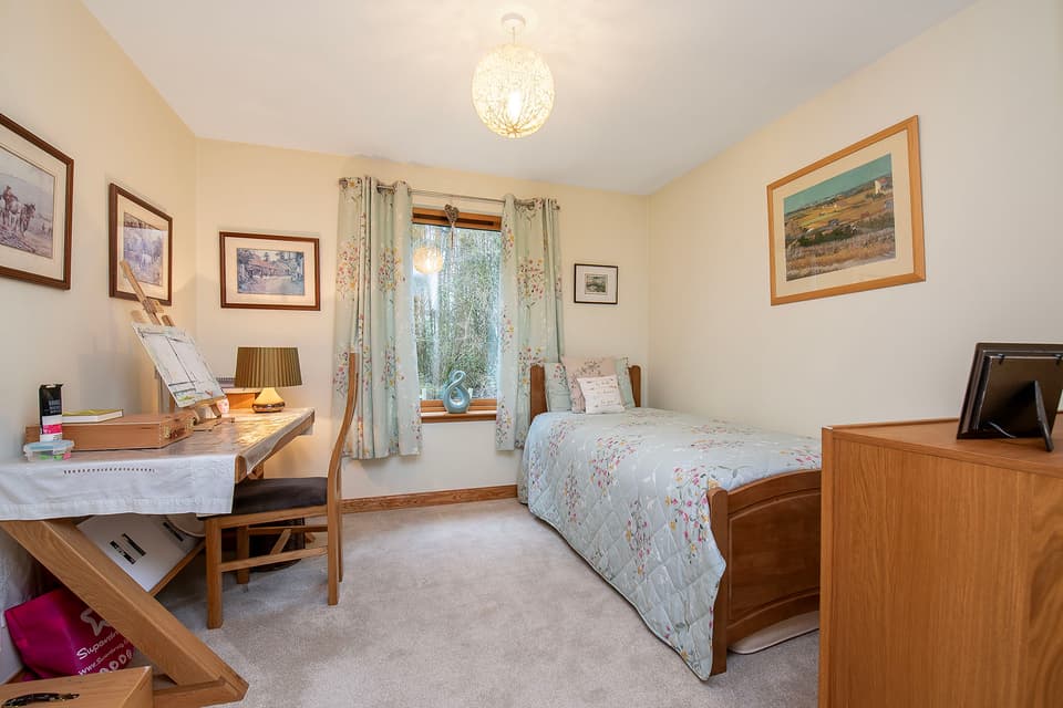 Positioned at one end of the home for extra privacy, the principal bedroom enjoys serene garden views and benefits from plush carpeting, triple fitted wardrobes, and a spacious, fully tiled shower room with storage for linen and toiletries.