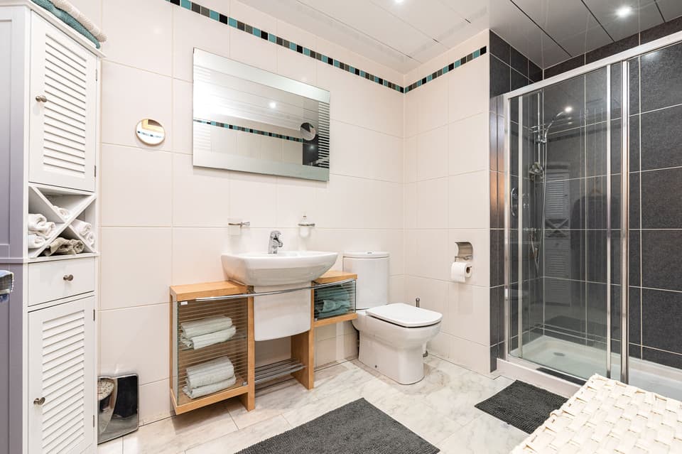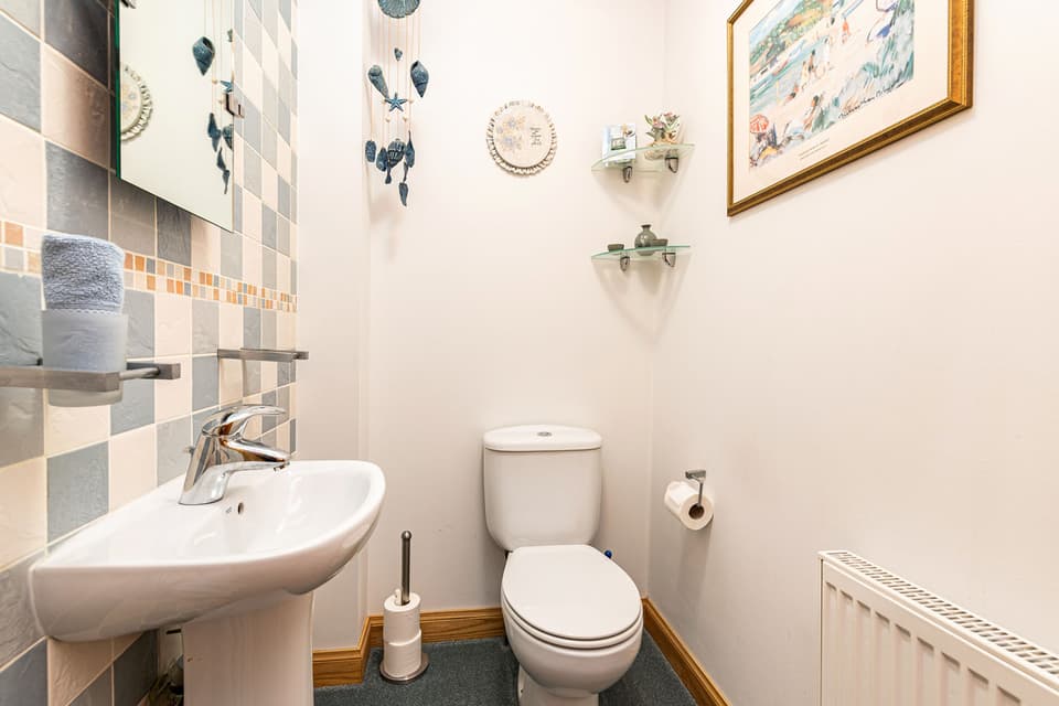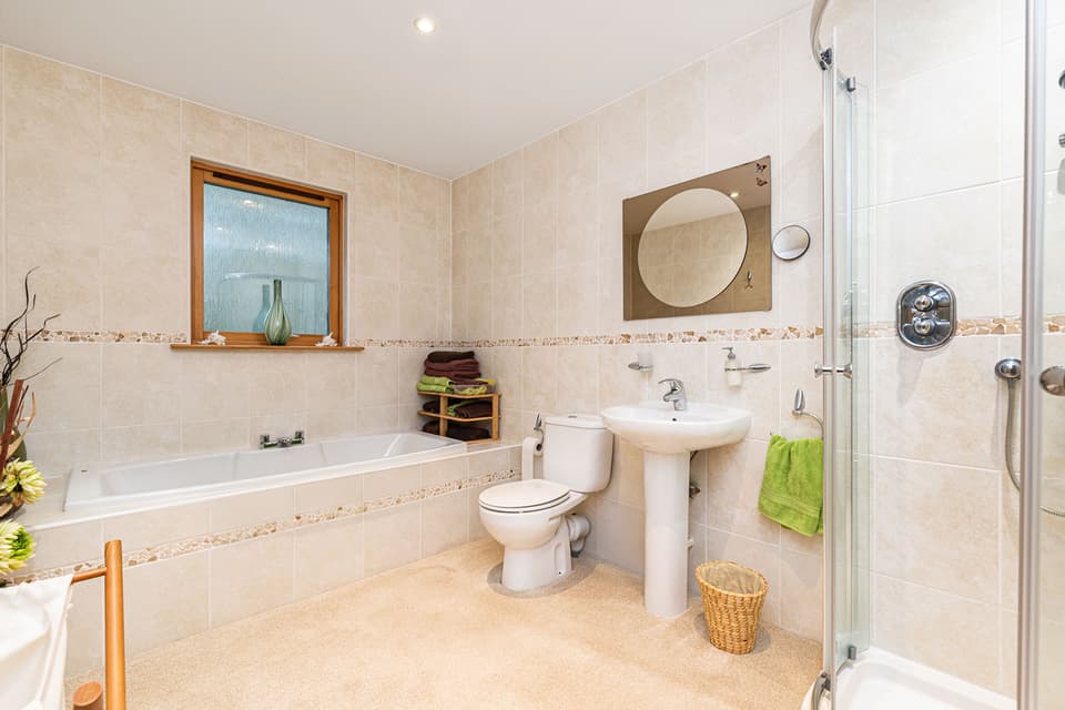 The chicly tiled family bathroom includes both a bathtub and a separate shower, and a guest WC is conveniently positioned off the hall, which also incorporates cloak storage and loft access.