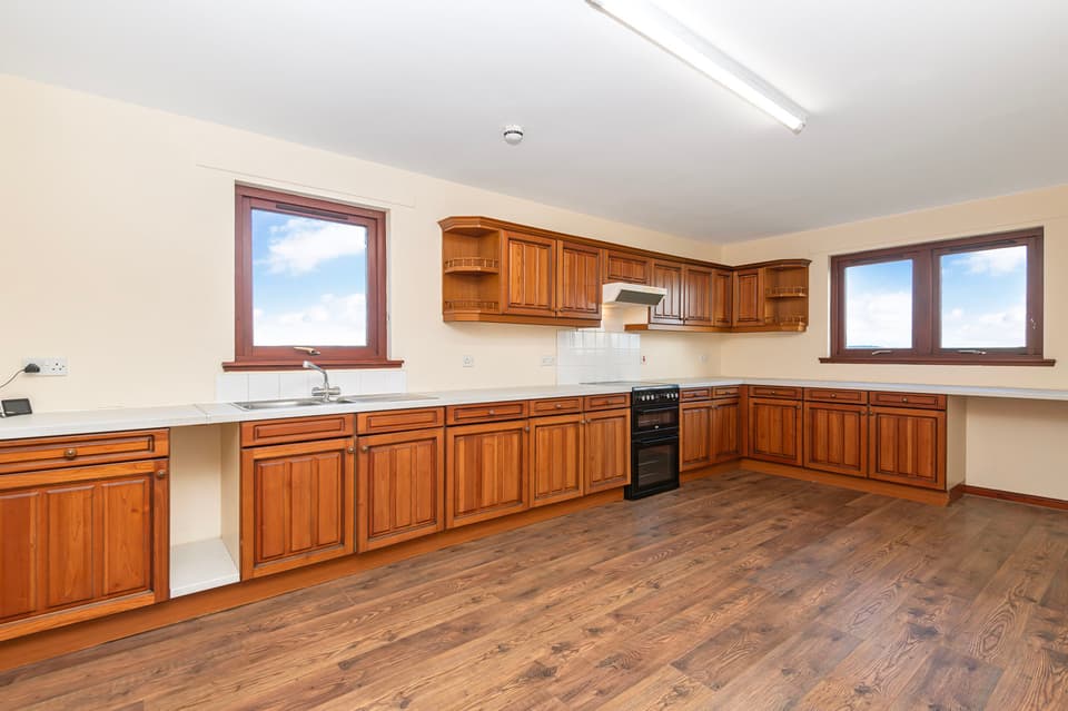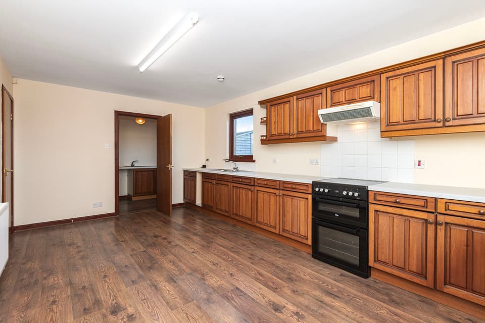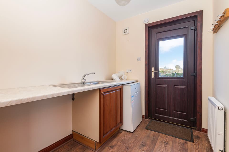 Equally spacious and airy, the kitchen/dining room also has a large footprint lit by dual-aspect windows. It easily accommodates a table and chairs, and is perfect for family meals and entertaining guests. Furthermore, it is generously appointed with a wide range of base and wall cabinets, alongside sweeping worksurfaces, ensuring optimal storage and workspace. An electric cooker is included, with room for additional freestanding appliances. There is also an adjacent utility room, supplementing the kitchen with further storage. Extras: all fitted floor coverings, light fittings, and an electric cooker to be included in the sale. Please note that no warranties or guarantees shall be provided in relation to any appliances included in the price.