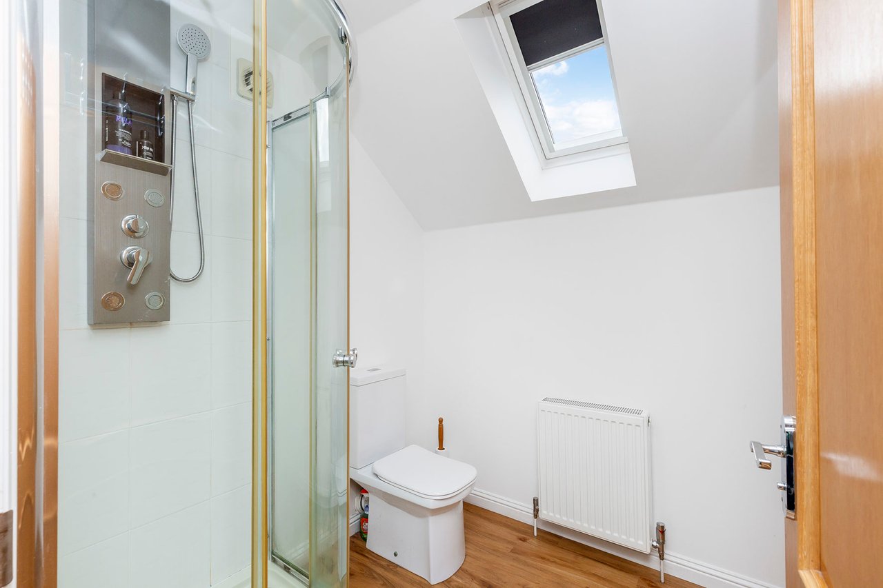 Along with the three contemporary en-suite shower rooms, the home has an opulent family bathroom located on the ground floor. It is fitted with a high-spec four-piece suite, featuring a toilet, a washbasin with generous storage, a shower enclosure with handheld and overhead rainfall showers, and a large whirlpool corner bathtub offering a spa-like experience.