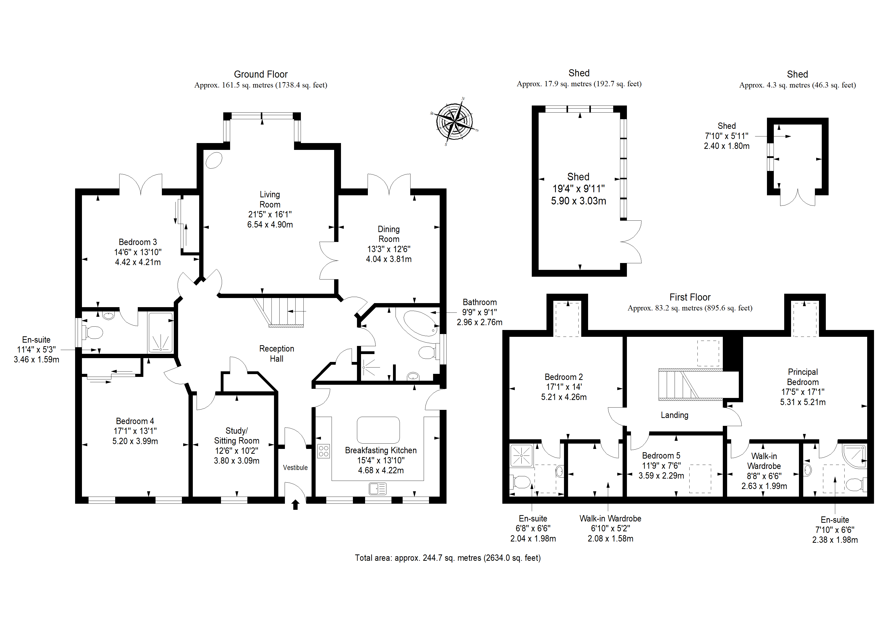 Located throughout the home, the five double bedrooms continue the high standards, providing lots of versatile space and luxurious features. On the first floor, the large principal and second bedrooms both have their own walk-in wardrobes and en-suite shower rooms, ensuring the very best. They also enjoy inspiring country panoramas from their elevated position as well. Bedroom five (a good-size double) is set between them. On the ground floor, bedrooms three and four are spacious doubles with built-in wardrobes. The former also has its own en-suite shower room and French doors flowing out into the rear garden. Furthermore, there is a versatile study/sitting room that provides a quiet setting for working from home or an additional reception area. It also offers the flexibility to be used as a sixth double bedroom if required.
