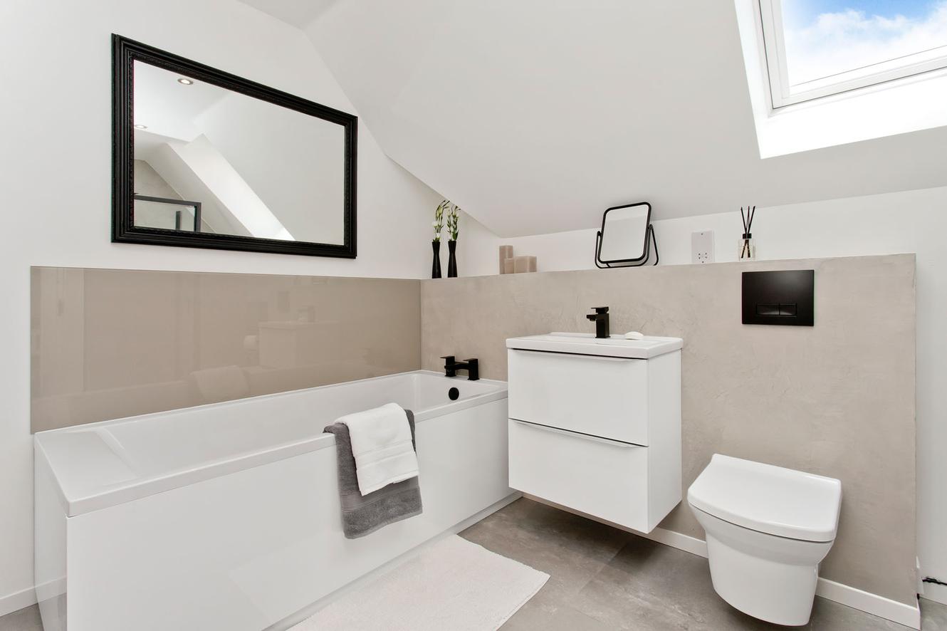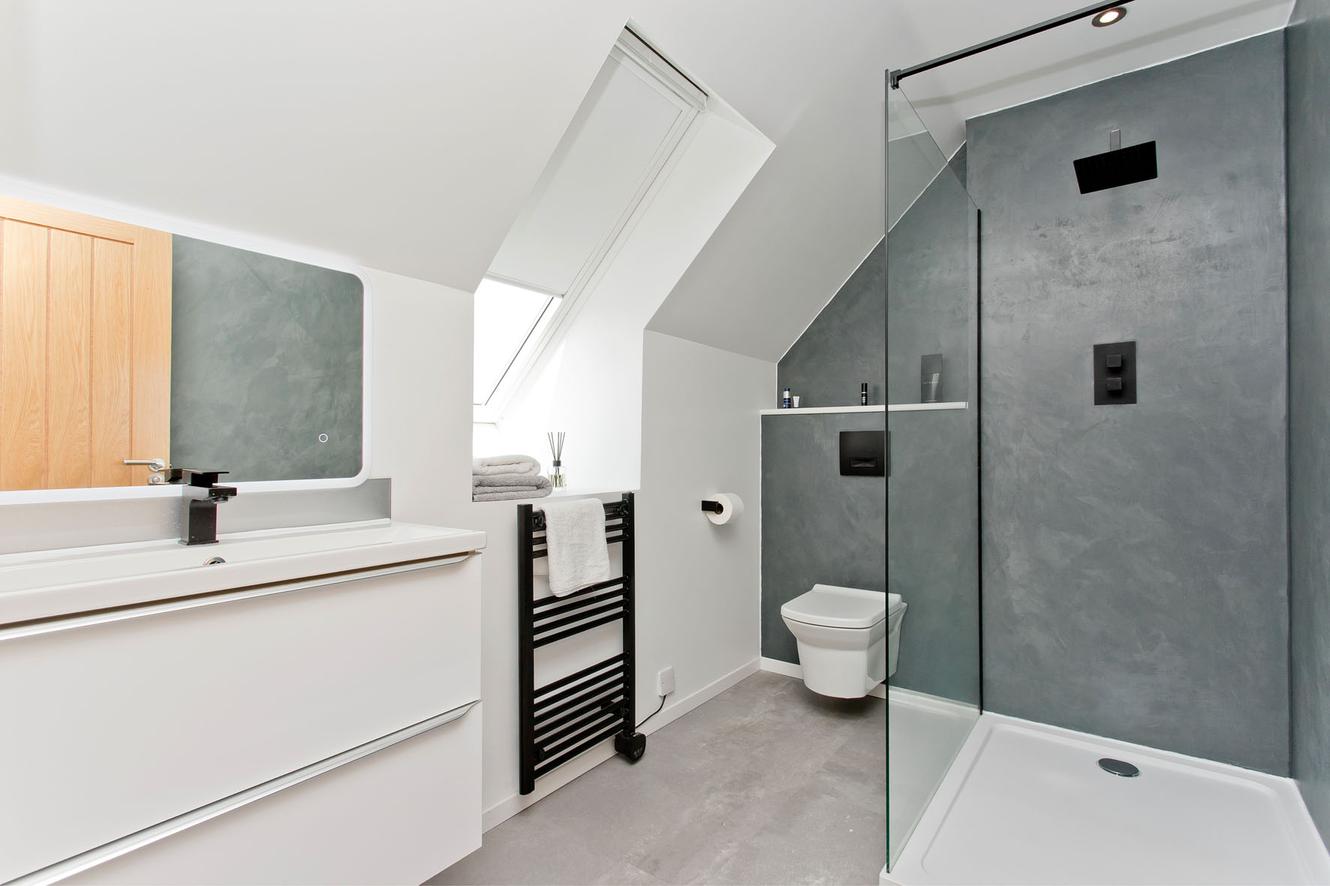 The principal suite is a luxurious retreat, featuring a bright bathroom with a walk-in rainfall shower, vanity storage, and a deep, freestanding bath that invites relaxation. Two additional bedroom suites offer deluxe shower rooms, enhancing convenience for family or guests. There is also a skylit, four-piece family bathroom upstairs, along with a WC on the ground floor for added practicality.