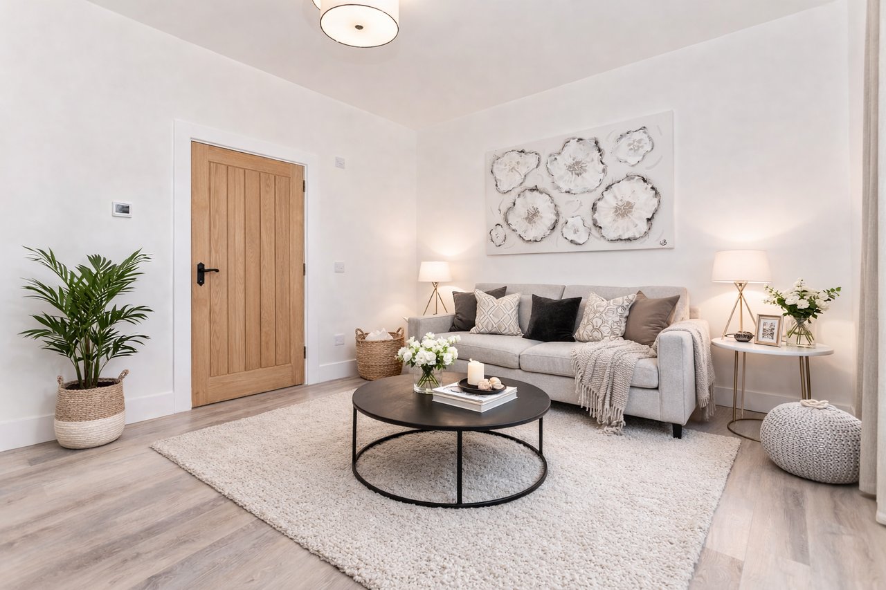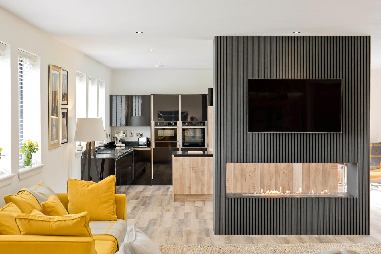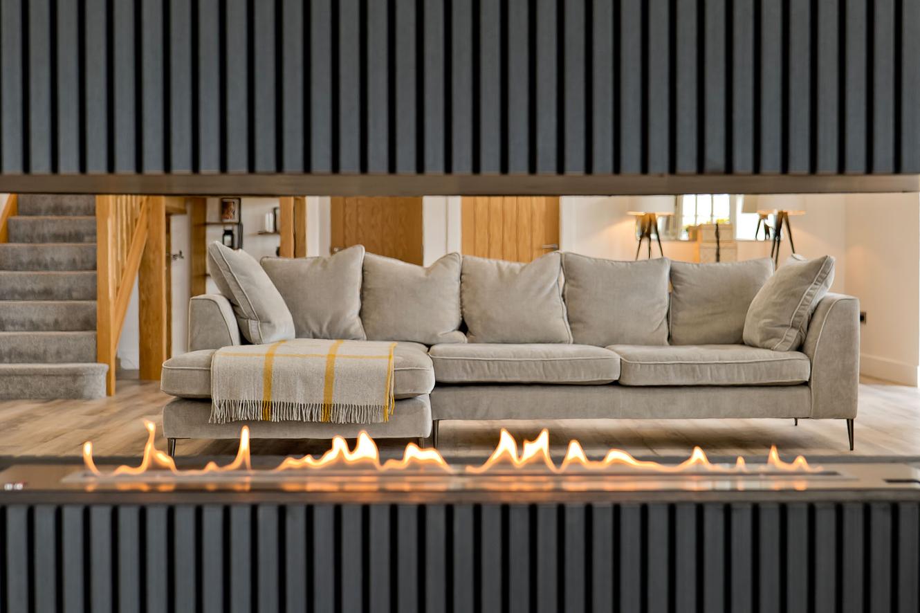 There is an instant welcoming atmosphere as you enter the home, directly into a spectacular open-plan reception area and kitchen. Extensive glazing, including numerous windows and wide sliding patio doors, floods the room with natural light. At the centre is a striking double-sided fireplace with a remote-controlled, eco-friendly bioethanol fire, offering winter warmth and a captivating focal point. The elegant oak-inspired flooring throughout adds a further homely touch.