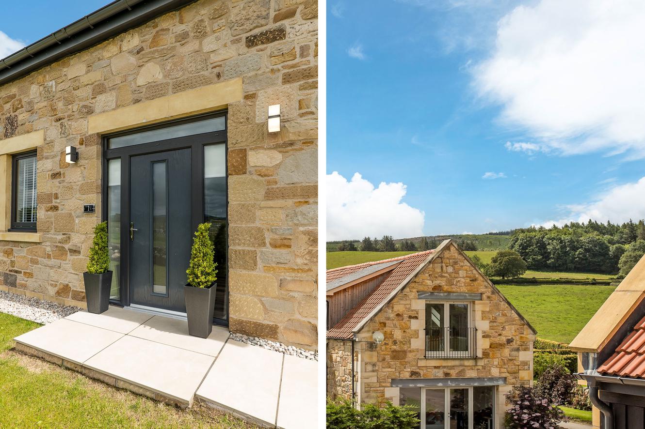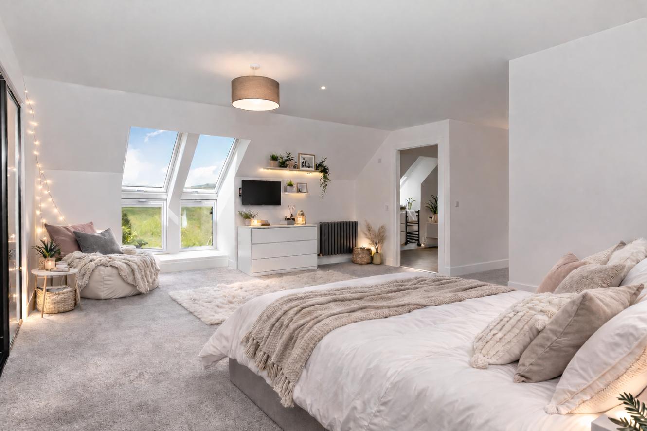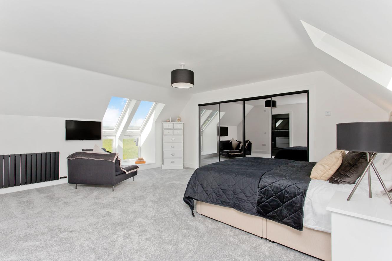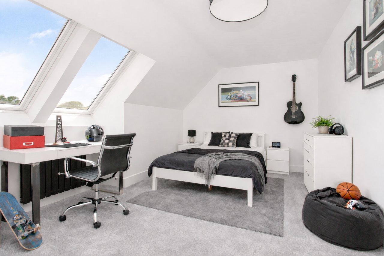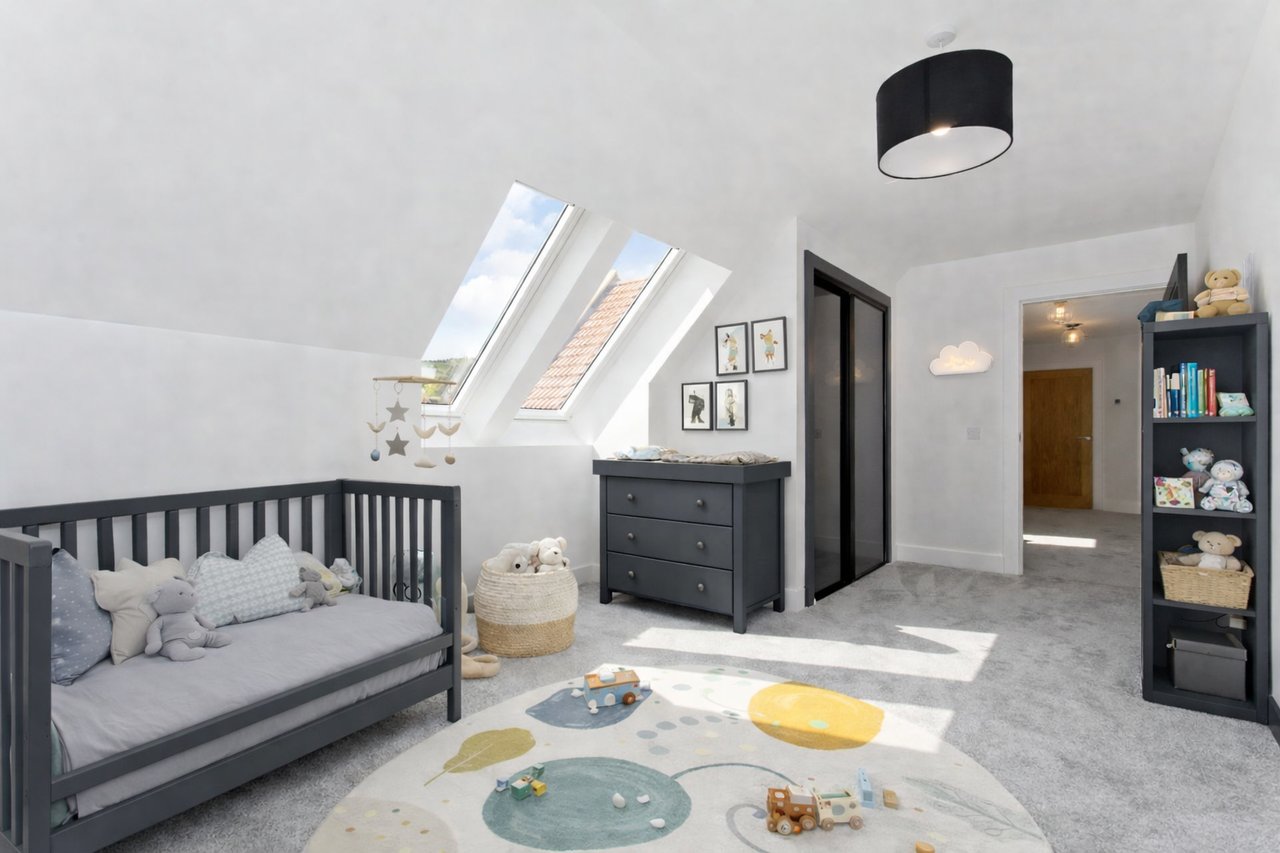 The first-floor rooms are accessed via a bright, carpeted landing, which also serves as a cosy reading nook. These bedrooms boast plush carpeting, with two, including the principal, featuring floor-length windows that allow blissful rural views to be enjoyed from bed.