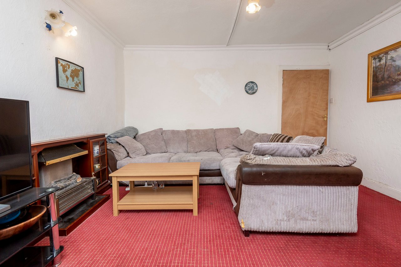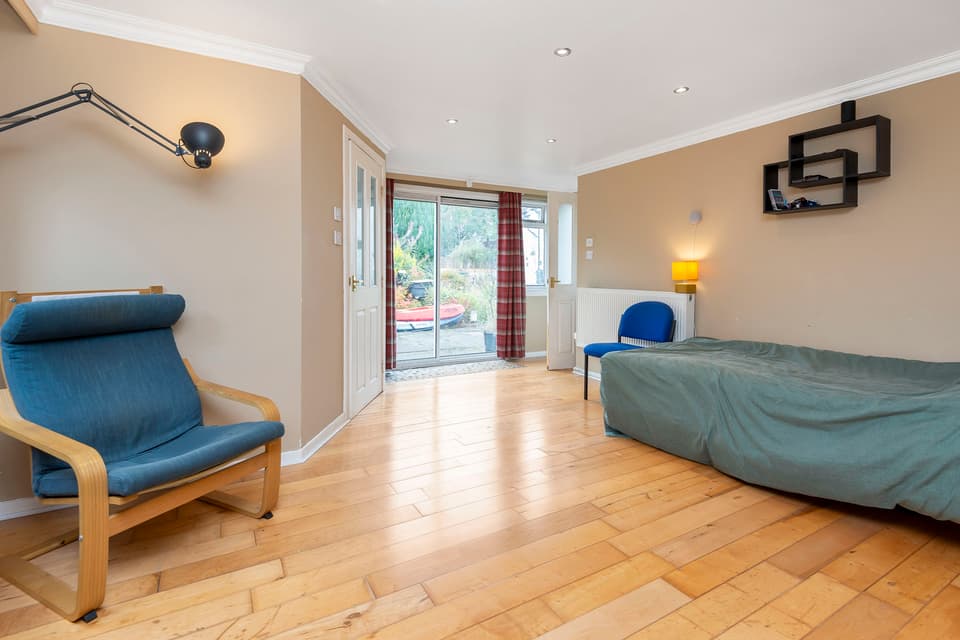 A traditionally tiled vestibule and adjoining entrance hall flow into two reception rooms, both well-illuminated by double windows. The living room features an elegant fireplace with an electric fire and the unusual benefit of an en-suite shower room, making it a flexible option for additional sleeping quarters. The second reception room provides space for both dining and relaxed seating, with useful storage and a direct connection to the kitchen. A third ground-floor living space, enhanced by wood-style flooring, neutral décor, and fitted shelving, offers the ideal home study or snug.