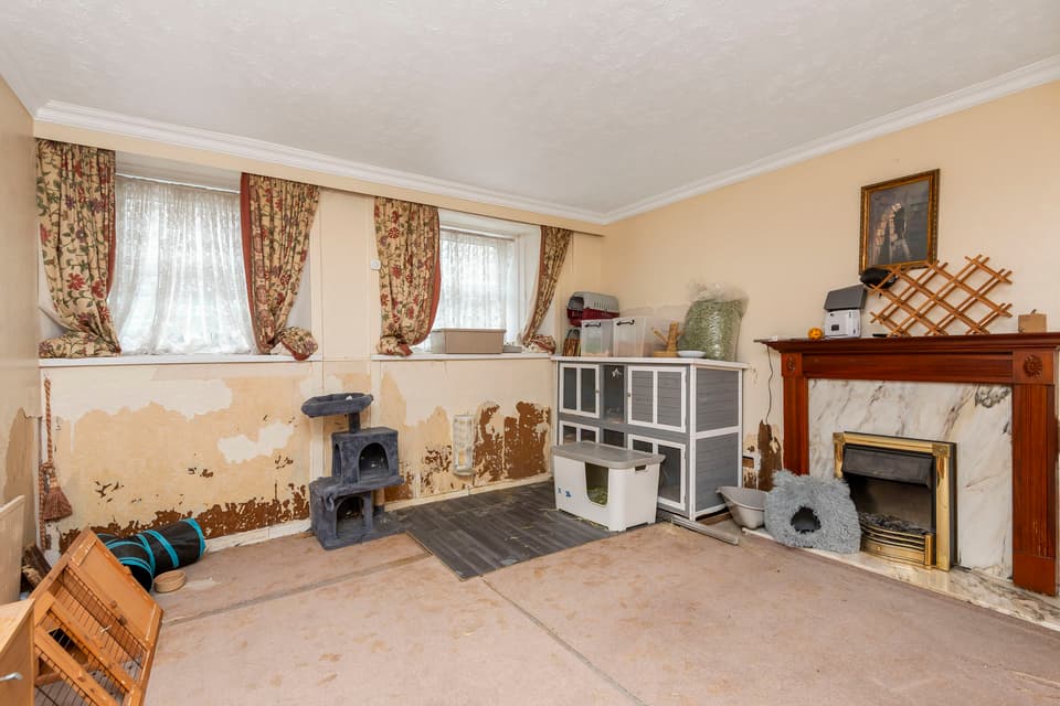 Versatile living room with double windows, fireplace, and en-suite shower room