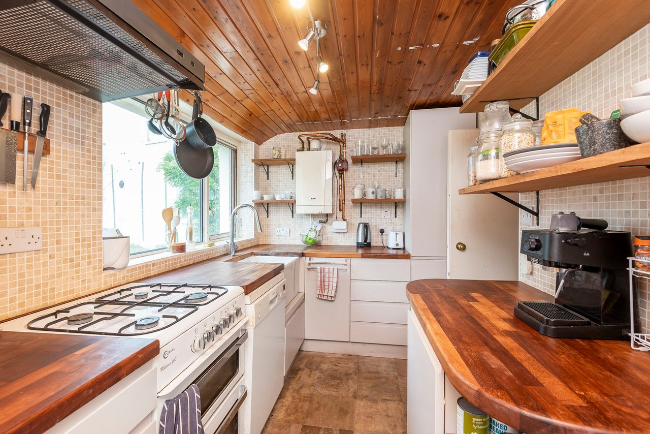 Overlooking the garden, the kitchen is appointed in a tasteful modern style, with sleek white cabinets, wood-toned worktops, and a mosaic-tiled splashback. A deep Belfast sink, an under-counter dishwasher, a freestanding gas cooker (and space for an upright fridge freezer) are included. Adjoining is a bright utility room with garden access. Subject to permissions, it could be incorporated into the kitchen to create an impressive open-plan dining hub.