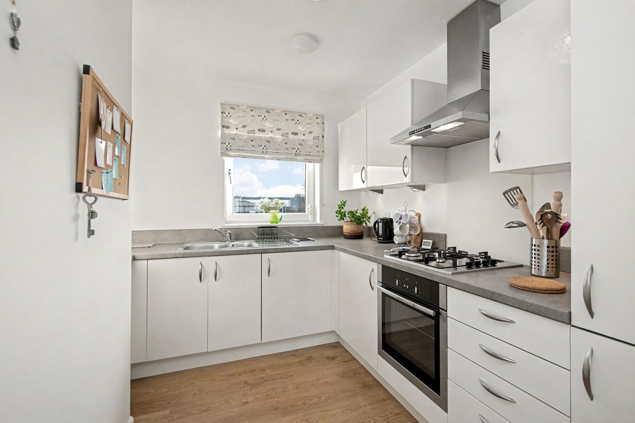 The property offers bright, modern accommodation throughout, with a welcoming open-plan lounge and kitchen forming the heart of the home. The lounge benefits from a stylish Juliet balcony, allowing natural light to flood the space, while the contemporary fitted kitchen is well equipped with an integrated oven and hob, fridge freezer, and an integrated washer/dryer.