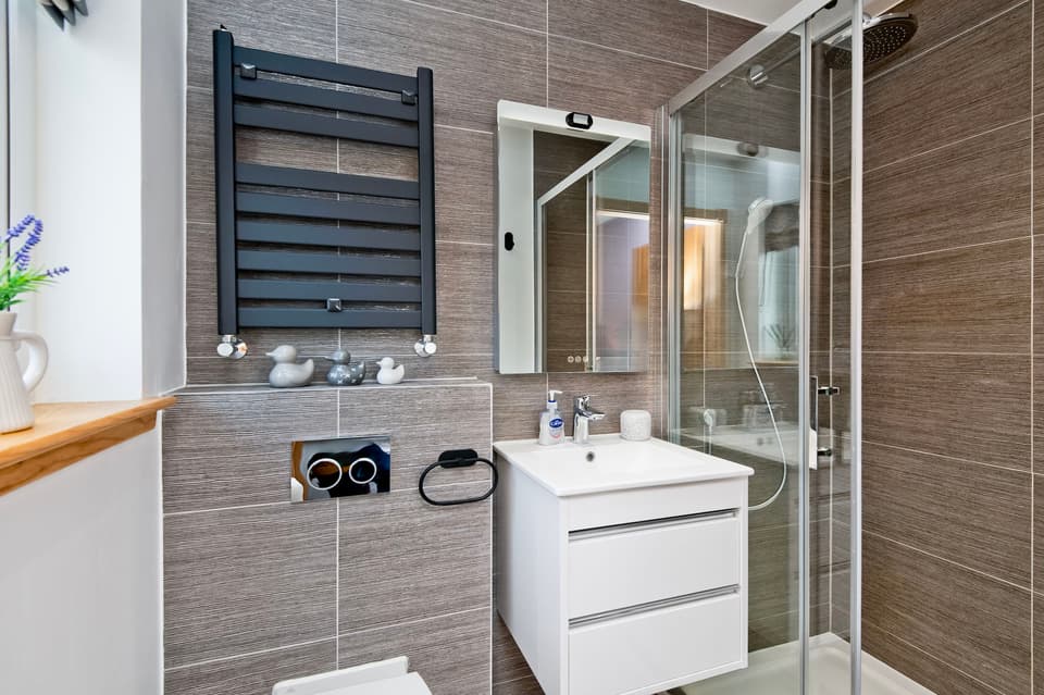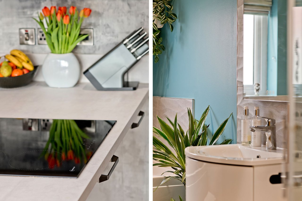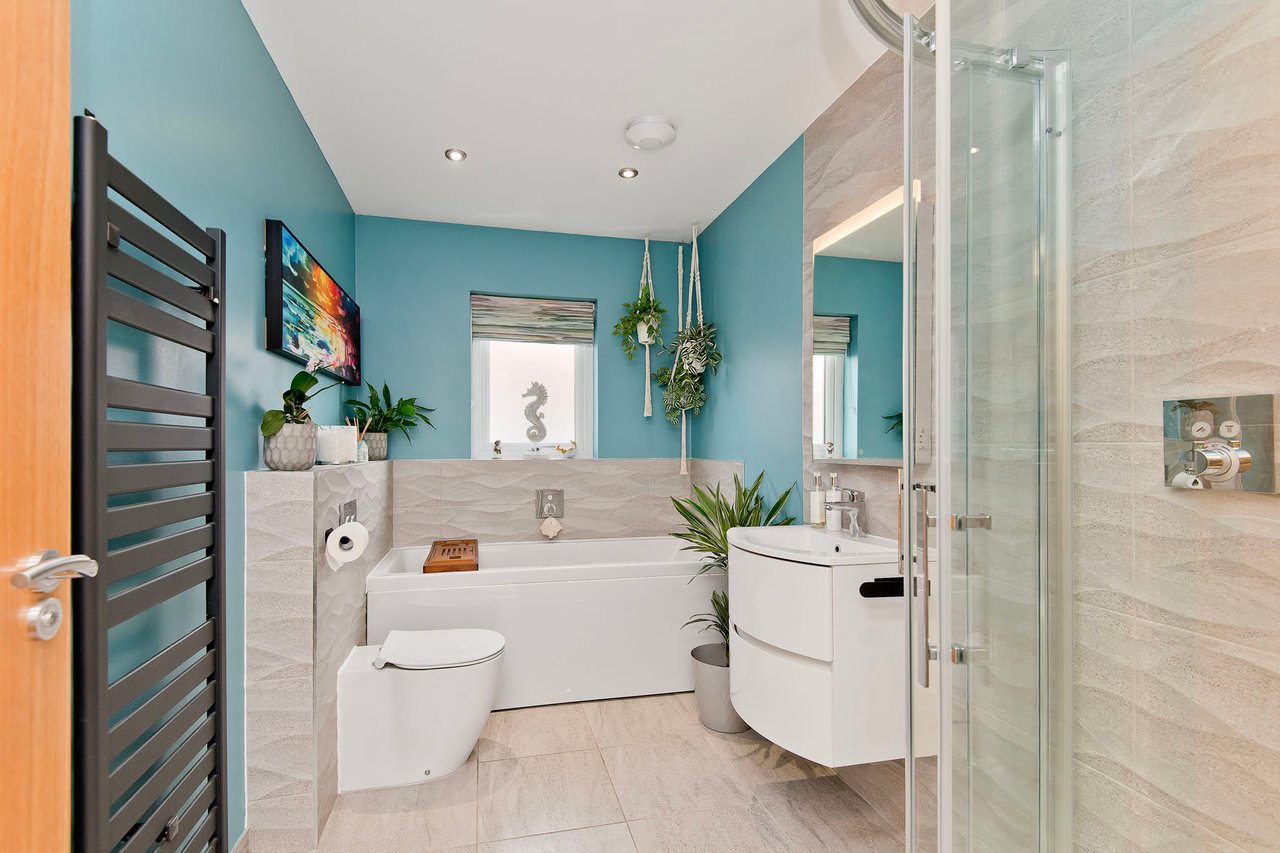 In addition to the en-suite, the property has a family bathroom that is finished to an equally high specification. Combining premium tiles with soothing blue décor, it has a beautiful aesthetic which is complemented by a white four-piece suite. This bathroom includes a storage-set washbasin, an illuminated mirror, a ladder-style towel radiator, a hidden-cistern toilet, a double-ended bath, and a shower cubicle.