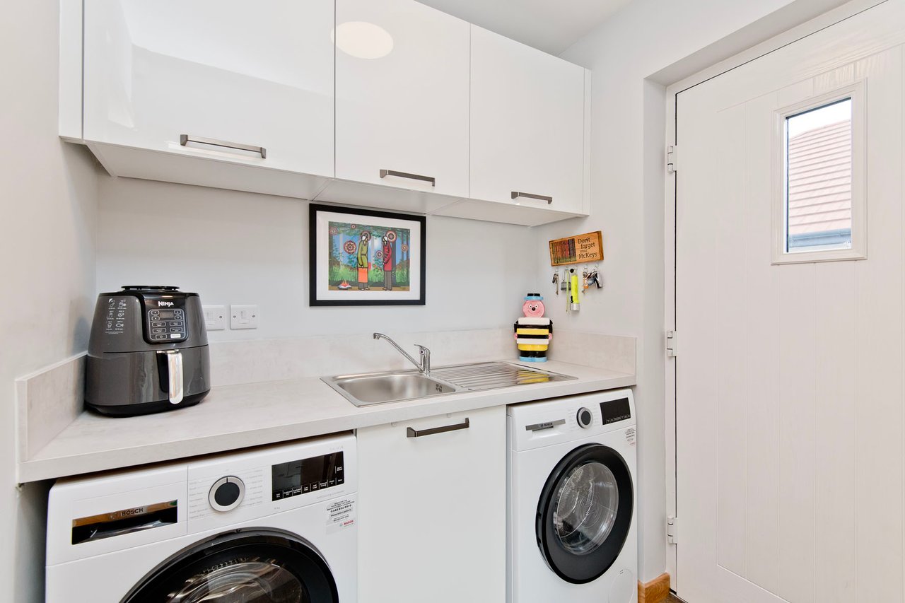 The kitchen adds to the sophistication of the living area, coming generously appointed with base and wall cabinets in white alongside complementary worktops. It includes a fitted breakfast bar for casual meals, a Quooker tap for instant boiling water, and under-unit lighting for ambient moods. The high-end look is further streamlined by a suite of integrated Neff appliances (induction hob, oven/grill, microwave, fridge/freezer, and dishwasher). It is a beautiful open-plan space designed to bring family and friends together. A matching utility room is adjacent providing further storage and alternate access to the driveway.