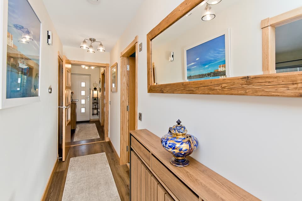 Nestled behind a low-maintenance front garden, the home’s main door opens with a strong first impression into a hall with crisp neutral décor. A wood-toned LVT floor and rich woodwork (including architraves and skirting boards) add to the inviting finish, while a handy cupboard provides useful storage.