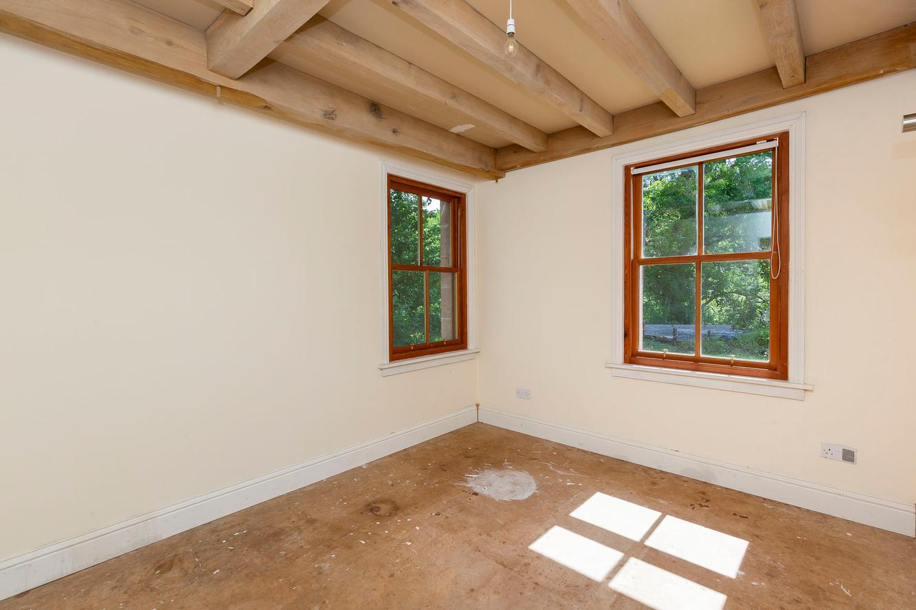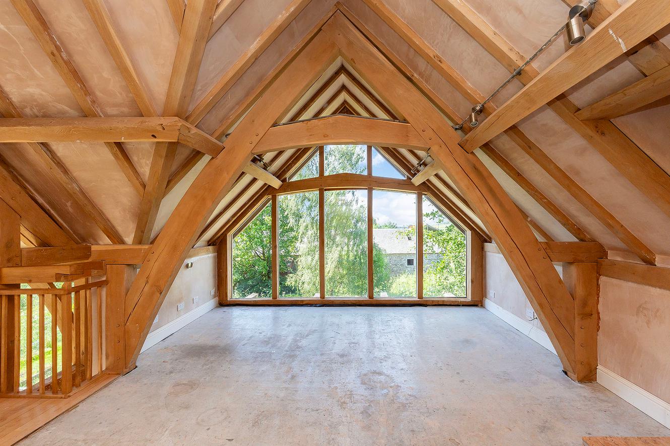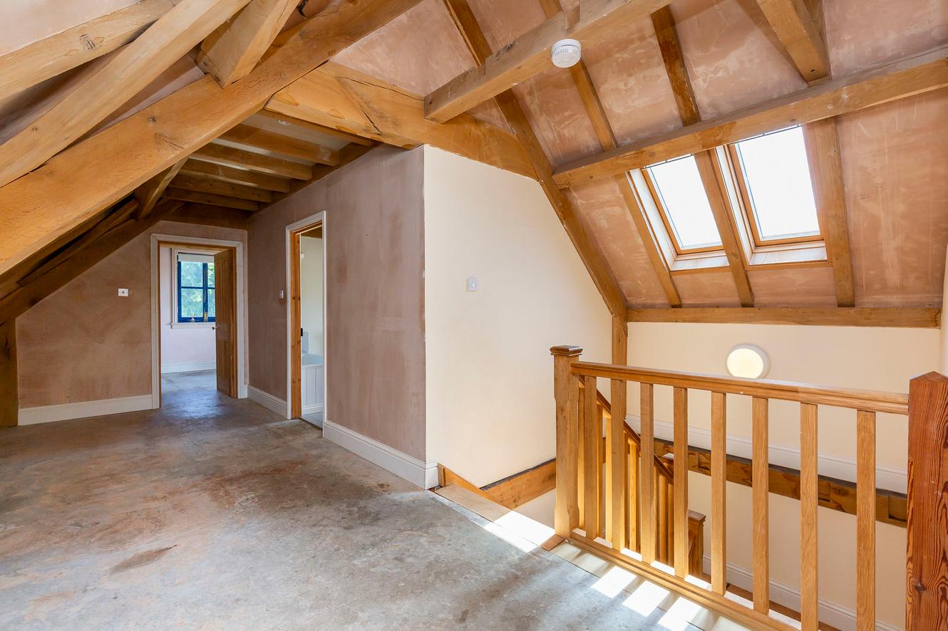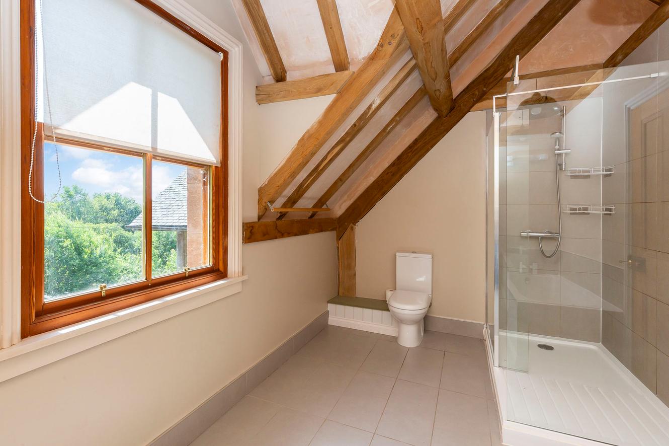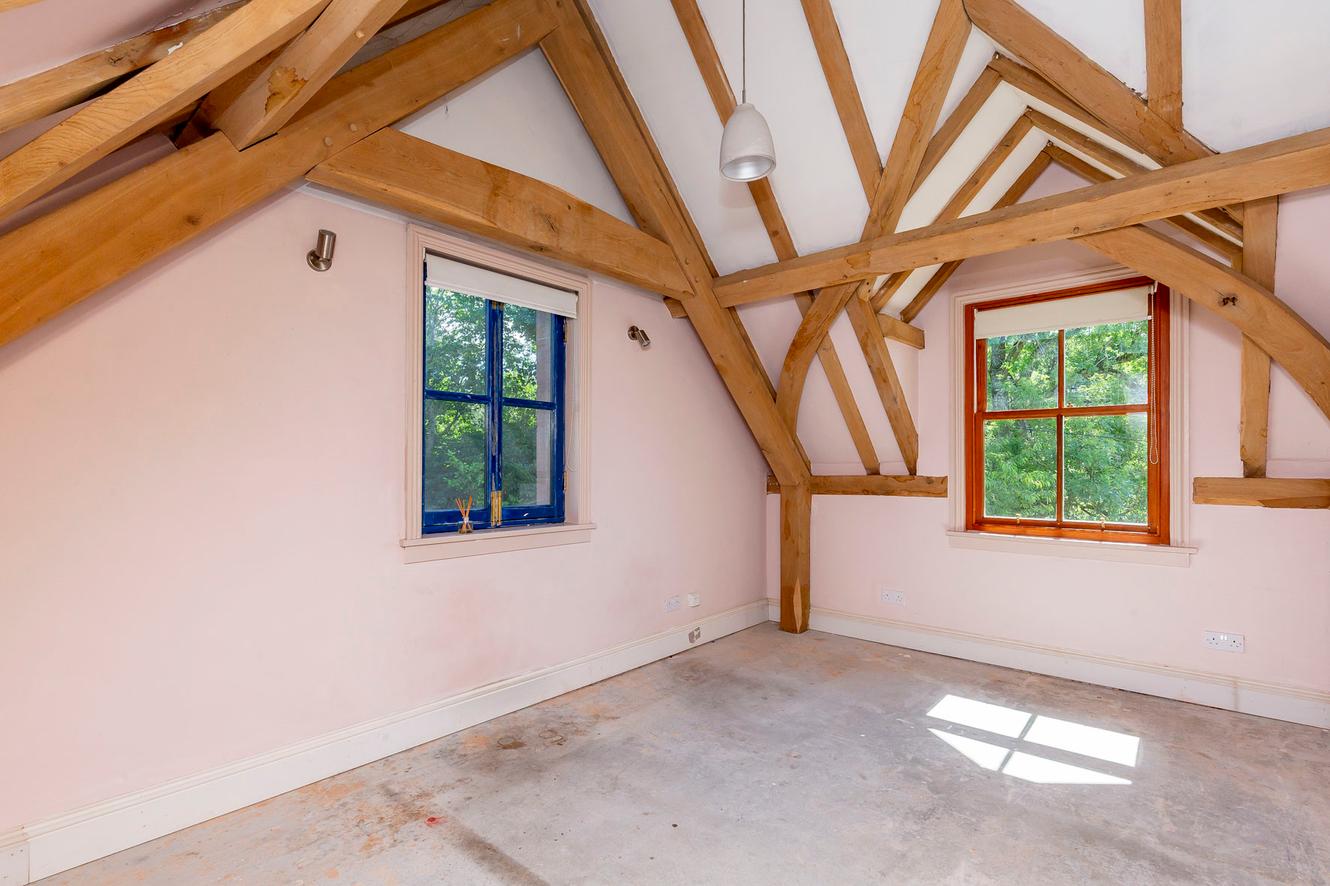 The four bedrooms are all spacious doubles with inspiring country and tree-lined views. All the rooms continue the charm of exposed wooden ceiling beams and all (except bedroom three) have dual-aspect windows as well, to make the most of the views whilst adding to the light and airy ambience. The principal and second bedrooms are on the first floor, off a landing lit by skylights, with bedrooms three and four easily accessible on the ground floor.