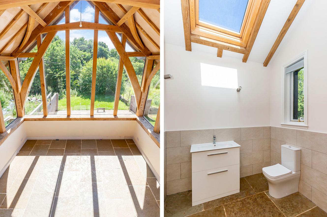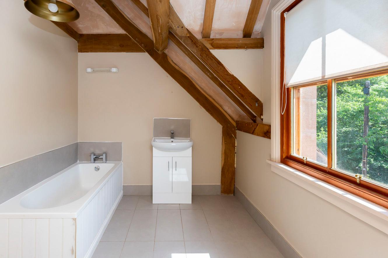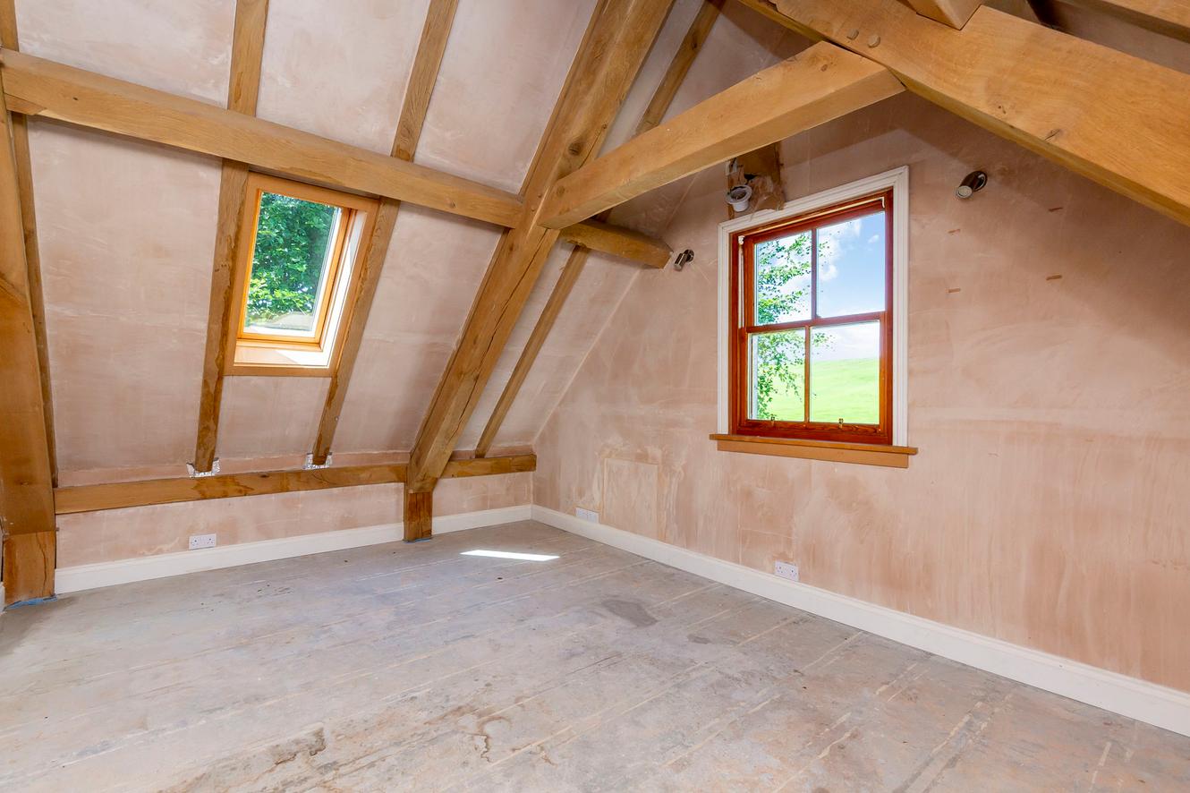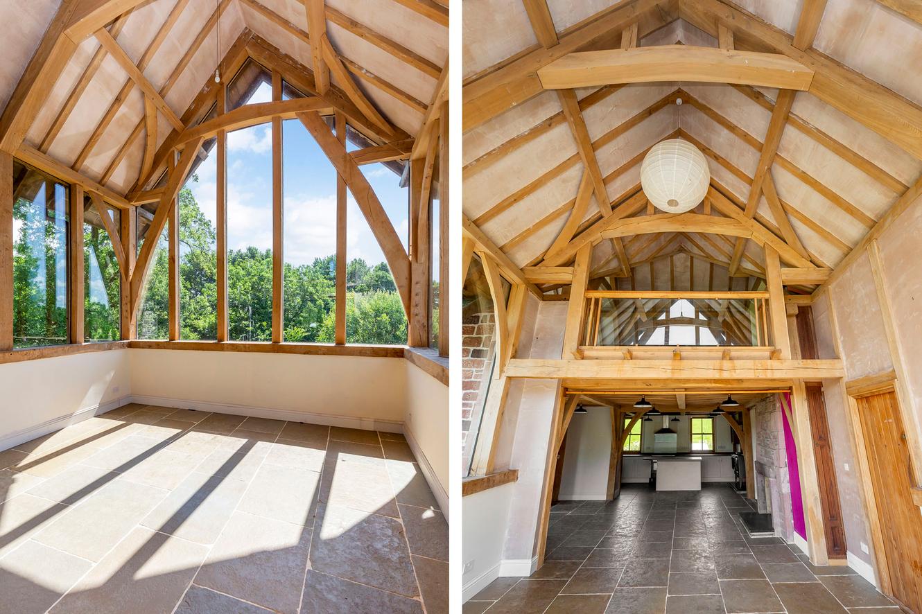 The four bedrooms are all spacious doubles with inspiring country and tree-lined views. All the rooms continue the charm of exposed wooden ceiling beams and all (except bedroom three) have dual-aspect windows as well, to make the most of the views whilst adding to the light and airy ambience. The principal and second bedrooms are on the first floor, off a landing lit by skylights, with bedrooms three and four easily accessible on the ground floor.