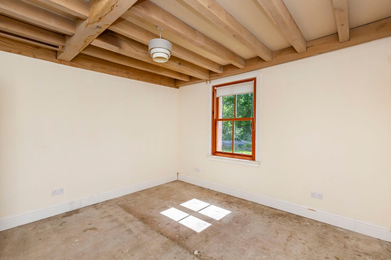 The open-plan kitchen, living and dining room is the show-stopping centrepiece of Cantsmill Cottage. This one-of-a-kind reception area has substantial dimensions for a wide assortment of furnishings and it boasts a majestic double-height apex ceiling framed by an incredible feature window and exposed wooden beams. With further multi-aspect glazing and French doors to outside, it captures the magic of the surrounding scenery, ensuring an unparalleled bright and airy atmosphere. It is truly stunning in every sense of the word.