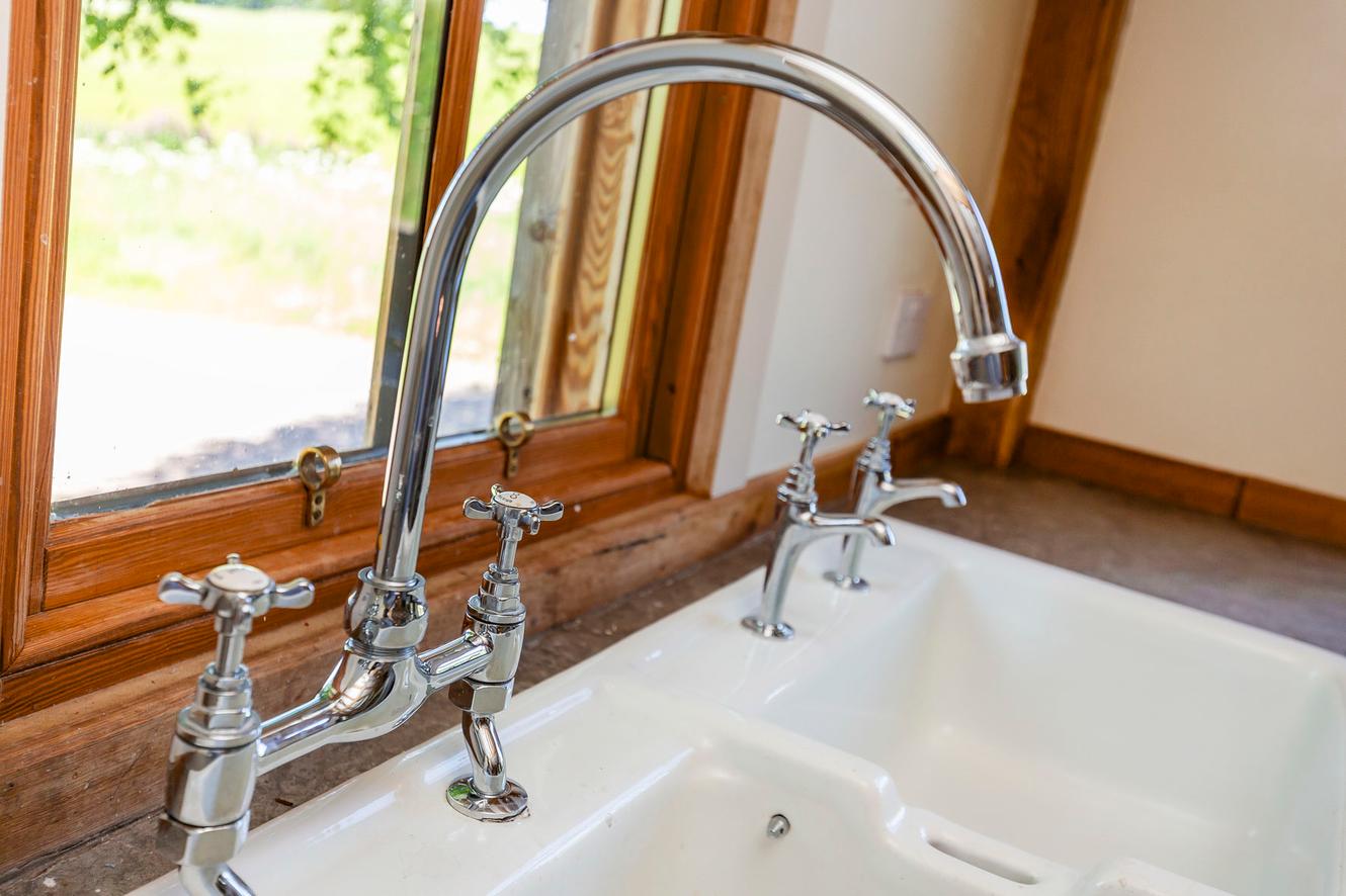 Nestled to the front of the open-plan reception room, the main kitchen is neatly zoned behind a central island with a breakfast bar. It has a Shaker-inspired design that is attractive to the eye and practical, featuring white cabinets and luxury worktops. It houses a gas range cooker and an Esse Ironheart solid fuel cooker, and comes with deep dual sinks and an integrated dishwasher. The countryside backdrop brings an additional touch of inspiration whilst cooking.