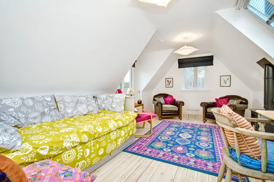 Large double-aspect living room with log burner and storage