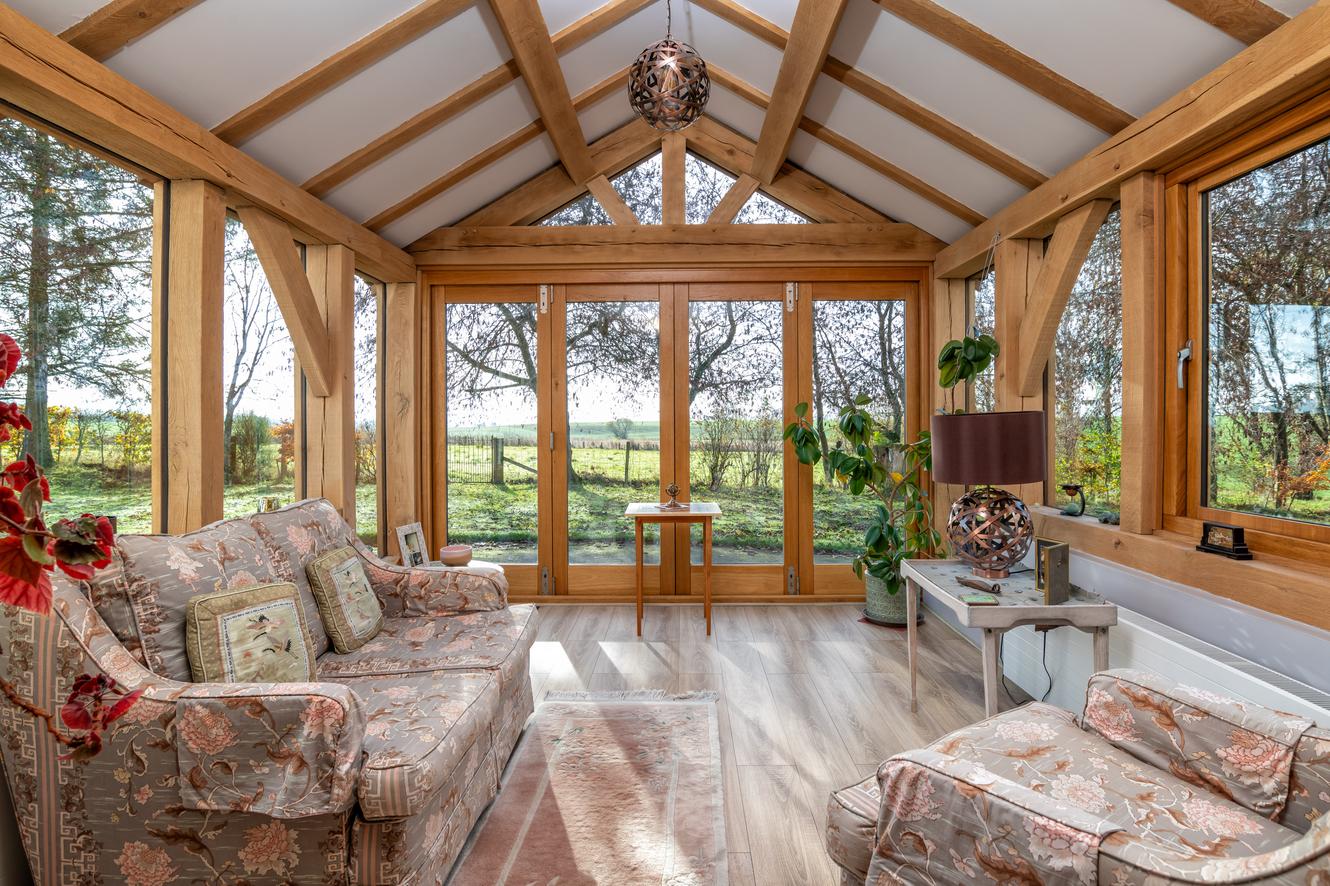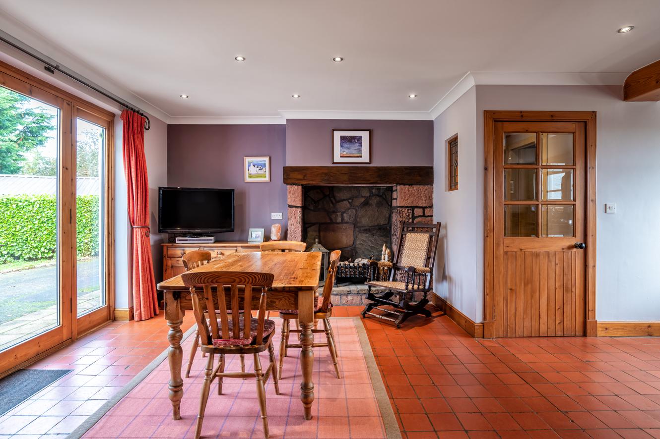 Internally, the property offers warmth, charm, and superb functionality for family living. A welcoming utility room with WC opens into a stunning farmhouse-style dining kitchen featuring rustic beams, a range cooker, Belfast sink, central island, and French doors opening to the garden. A spacious study hallway with a log-burning stove links the kitchen to the main reception hall, which in turn leads to two elegant formal rooms: a sitting room with grand working fireplace, intricate cornicing, and timber flooring, and a formal dining room with similar period detailing. A standout highlight is the contemporary oak-framed garden room, with glazing on three sides and bi-folding doors that provide uninterrupted views across the grounds and paddocks.