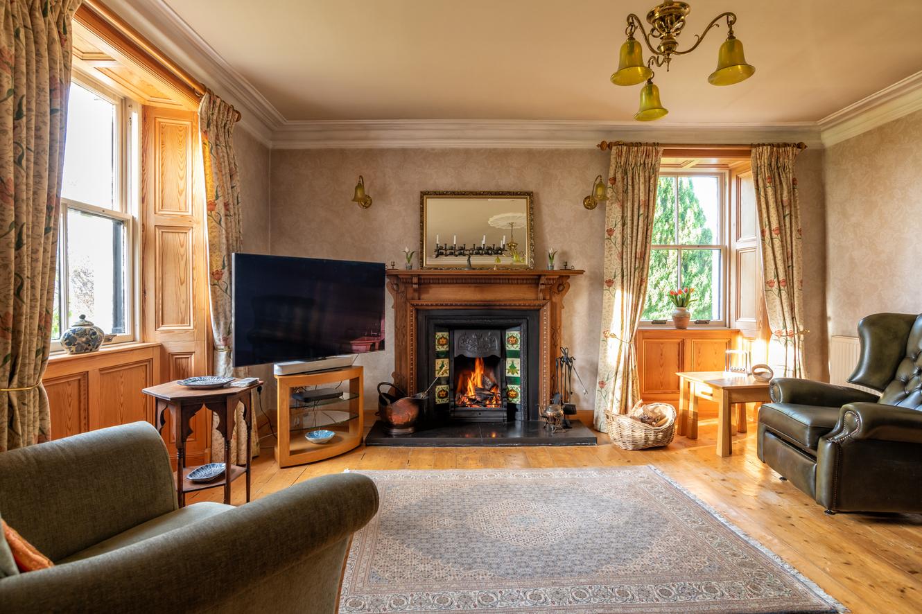 The interior combines warmth, charm and practical family living. A welcoming utility room with WC leads to the impressive farmhouse style dining kitchen, featuring rustic beams, a range cooker, Belfast sink, central island and French doors to the gardens. Adjacent is a spacious study hallway with a log burning stove. The front reception hall leads to two elegant formal rooms: a sitting room with grand working fireplace, intricate cornicing and timber floors, and a formal dining room showcasing similar period detailing. A standout feature of the home is the contemporary oak framed garden room with glazing on three sides and bi folding doors providing uninterrupted views of the grounds.