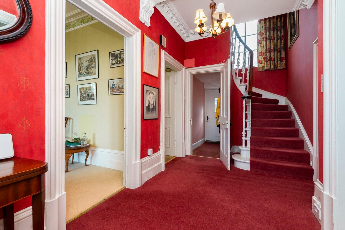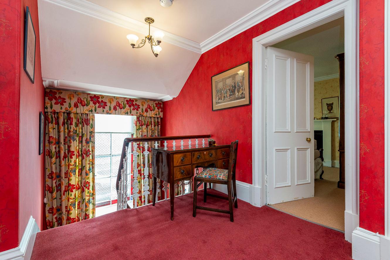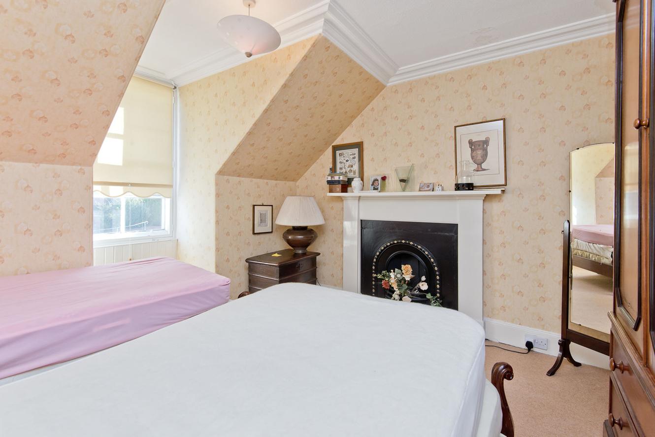The home’s four carpeted bedrooms are comfortable doubles, each enhanced by classic cornicing and period fireplaces. One bedroom, southerly facing with built-in storage, is located downstairs, offering flexibility for additional living space. The remaining bedrooms are situated on the first floor, accessible via a staircase lit by a generous window with colourful stained-glass edging. This staircase leads to a light and airy landing with a study area and built-in storage. Two first-floor bedrooms, including the principal, enjoy the serenity of open river views and there is also a sky-lit box room - perfect for storage, a dressing room, or a study.