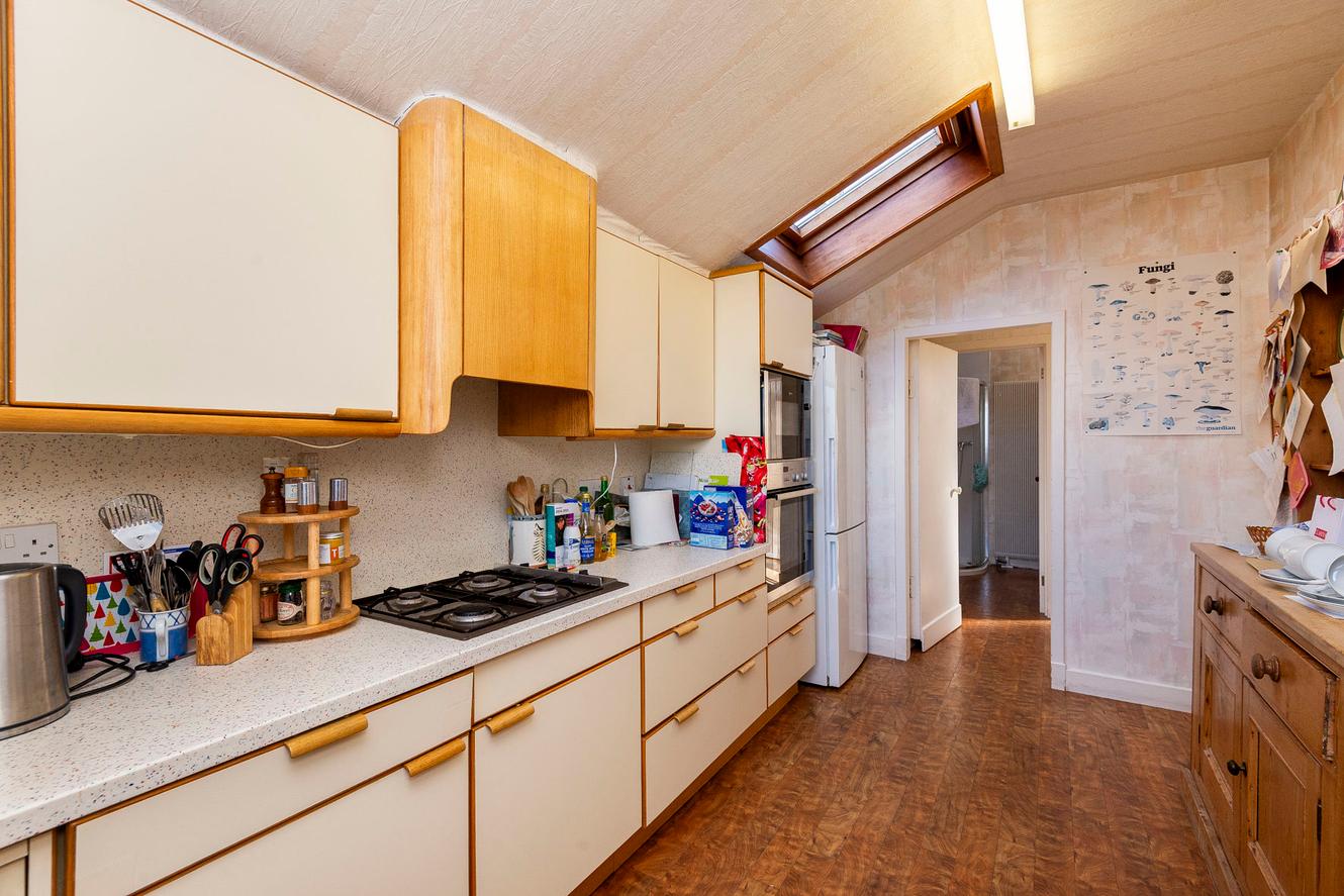 The bright, naturally toned kitchen is functional, though it could benefit from modernisation. A range of cabinets is integrated with a double oven and a gas hob. There is also an upright fridge-freezer, plus space for more appliances in an adjoining utility room. From here, practical driveway access is through a small, sunny conservatory.