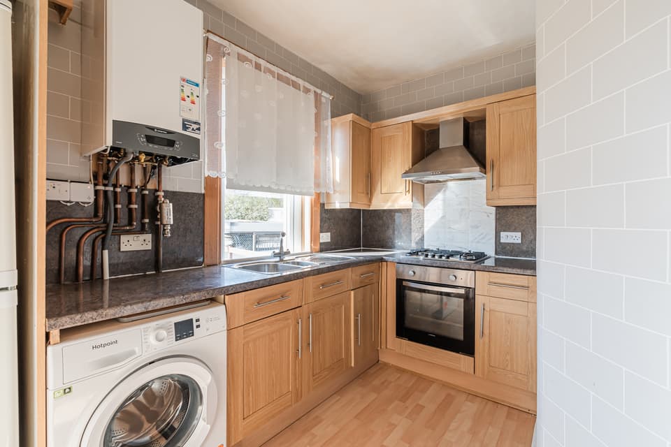 Offering bright and functional living space, the property comprises a welcoming living/dining room, separate kitchen, two good-sized bedrooms, and a bathroom. The overall layout is efficient and well suited to modern living. Additional benefits include private gardens to front and rear, shared drying green to rear, gas central heating (installed September 2023) and double glazing.