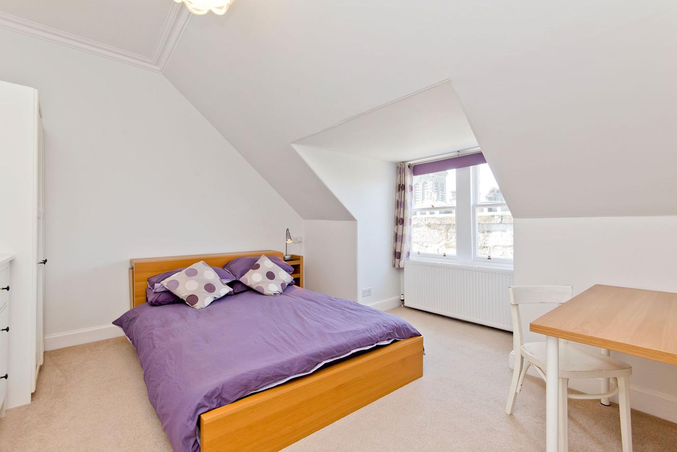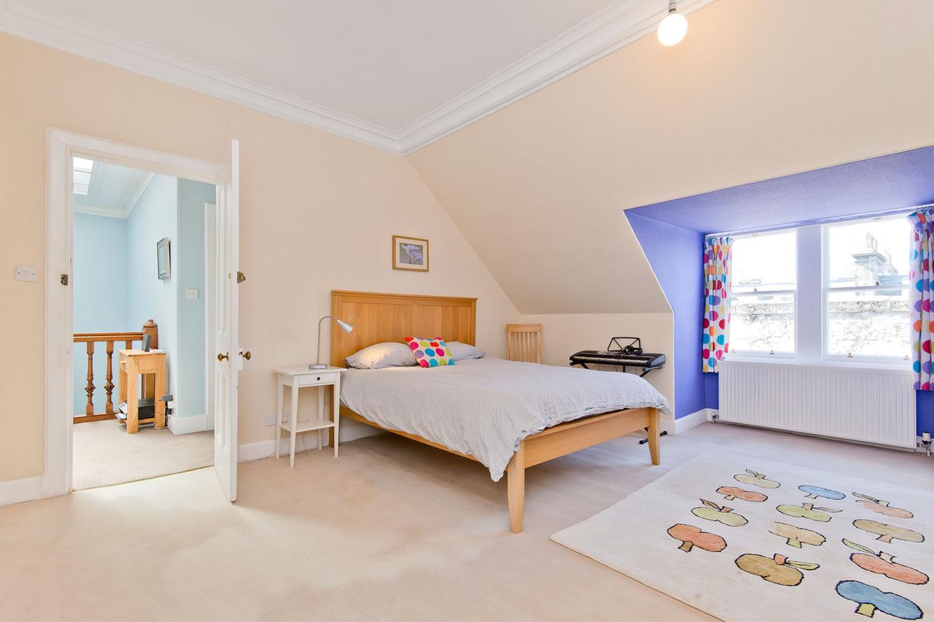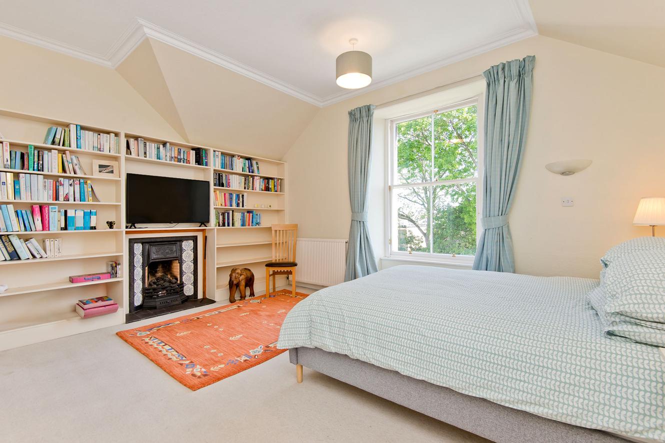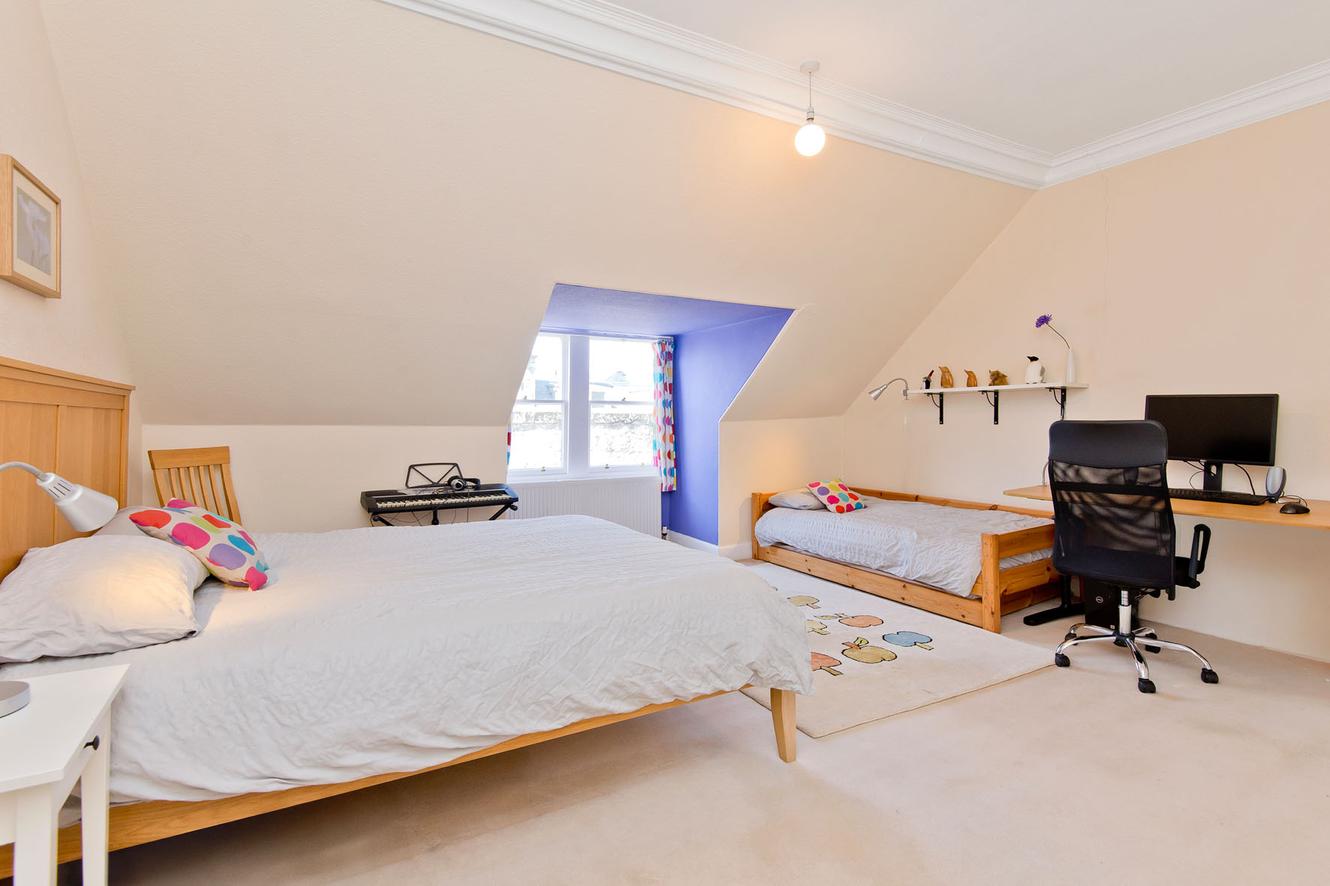 On the first floor is a generous principal bedroom with ample storage and a small double bedroom/study, both enjoying a leafy rear aspect. The second-floor houses three good-sized double bedrooms nestled beneath the eaves, with storage in the two largest rooms. All bedrooms are carpeted for comfort and accentuated by charming features such as cornicing and, in one room, a decoratively tiled cast iron fireplace (with a disconnected living flame fire) framed by book shelves.