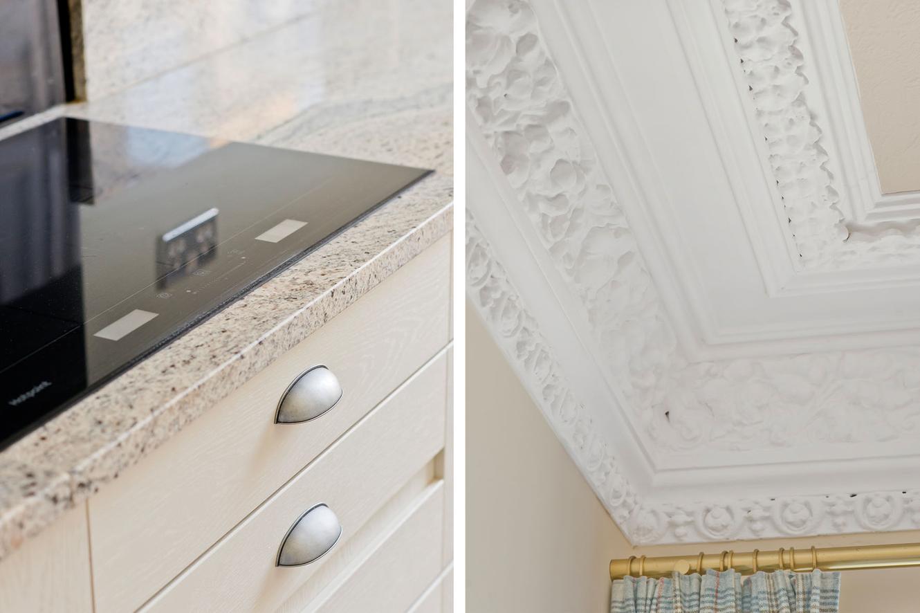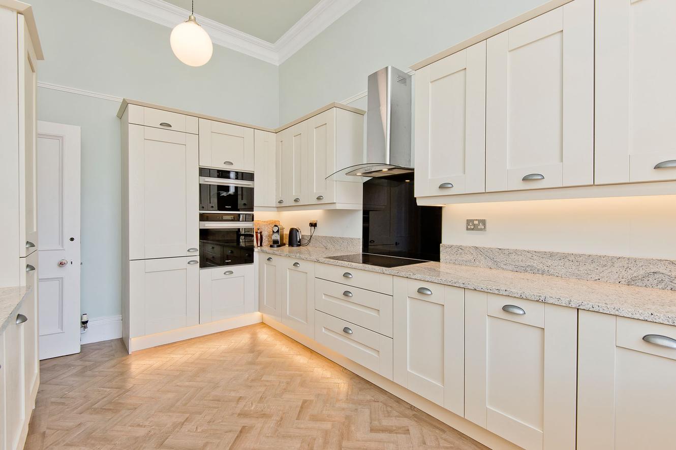 Conveniently located next to the reception room, the light-filled contemporary kitchen boasts a casual breakfast area beside a floor-length sash window. It is exceptionally well-appointed and showcases a timeless Shaker-inspired design with downlit ivory-white cabinets, complemented by granite worktops, a sink fitted with an Insinkerator waste disposer, and a stylish herringbone floor. Fully integrated appliances include a fridge freezer, dishwasher, oven, microwave oven, and induction hob with a feature hood. In a practical second-floor utility room, you’ll find a freestanding washing machine, tumble dryer, and an extra fridge freezer.