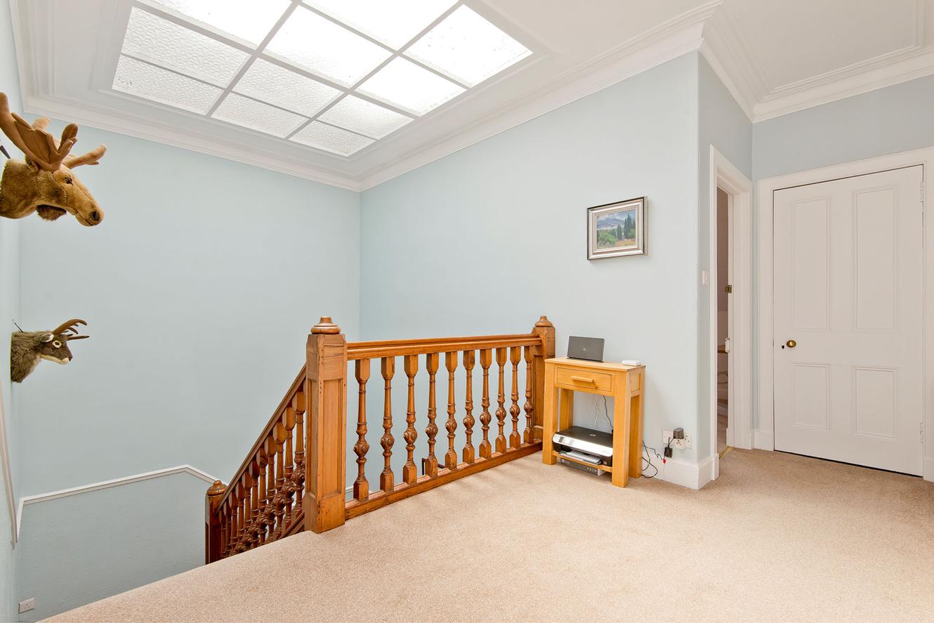 Access to the flat is gained via a vestibule (shared with just one other property) and a secure buzzer system. Inside, a bright hall features central stairs with a handsome oak bannister, leading up to airy landings on each level, both flooded with light from a large cupola. Soft carpeting flows throughout for an instantly welcoming impression.