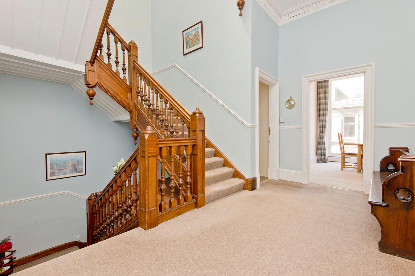 This double upper flat in a listed Georgian townhouse offers a spacious and characterful family home with five versatile bedrooms, two bathrooms, generous living spaces, and outstanding storage. Centrally located in St Andrews’ historic conservation area, this desirable residence provides access to unrestricted on-street parking and exclusive residents’ gardens.