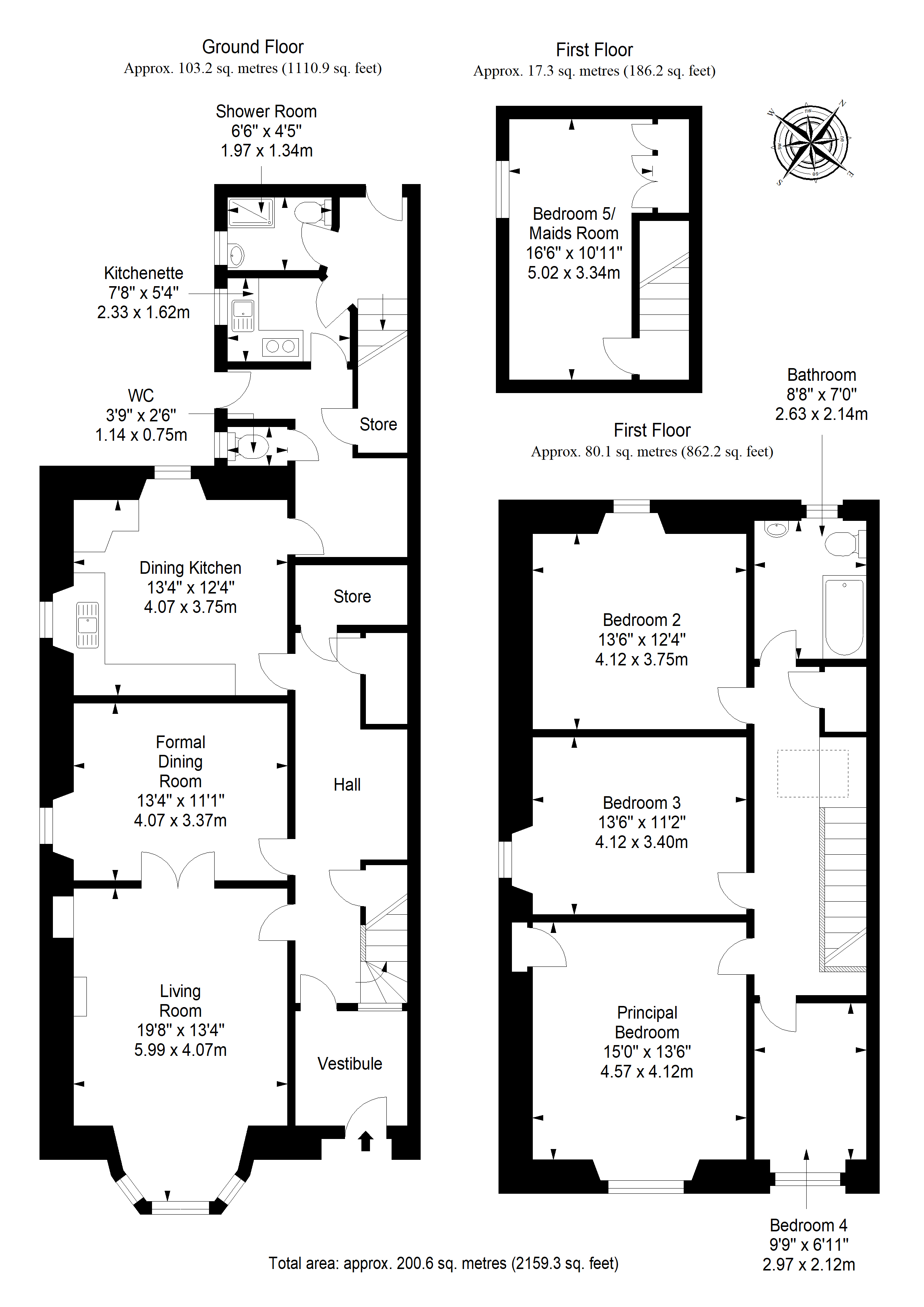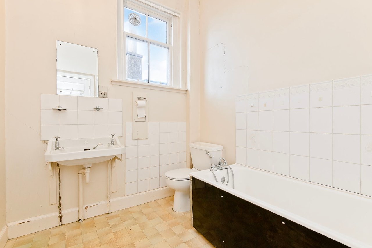 Kitchen – A large kitchen ready to grow into a hub for family life. Illuminated by dual-aspect sash windows, the dining kitchen is wonderfully bright and spacious, offering abundant potential to become a hub for family life. It can host a very generous selection of cabinets and sweeping worktops, whilst retaining plenty of floorspace for a large dining table and chairs. Just off the kitchen, a rear hall also provides access to the garden, as well as a store, a WC, and a kitchenette that will make an ideal utility space.