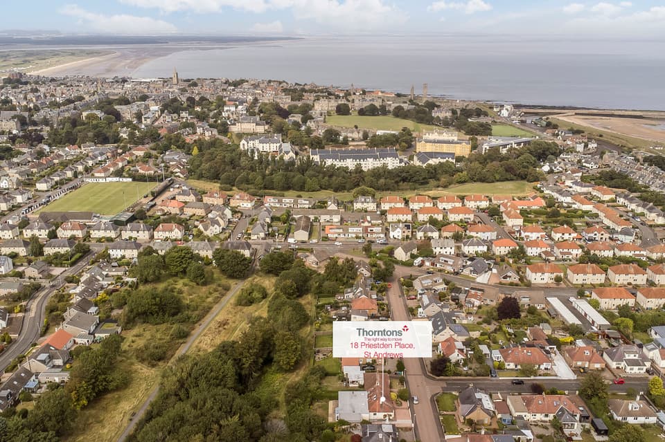 This semi-detached chalet bungalow in sought-after St Andrews is immaculately presented with contemporary interiors throughout spacious accommodation. The family home includes five double bedrooms, three reception rooms, and a south-facing kitchen. Completing the accommodation is a modern shower room, two en-suite shower rooms and an en-suite WC. Externally, 18 Priestden Place benefits from low-maintenance gardens, lawned and sunny to the rear, with outdoor seating space and ample private parking, including a gravel driveway and a single garage.