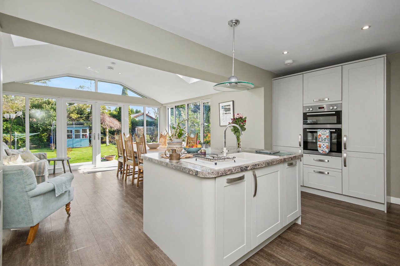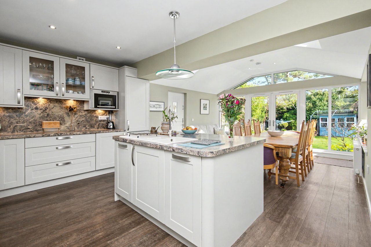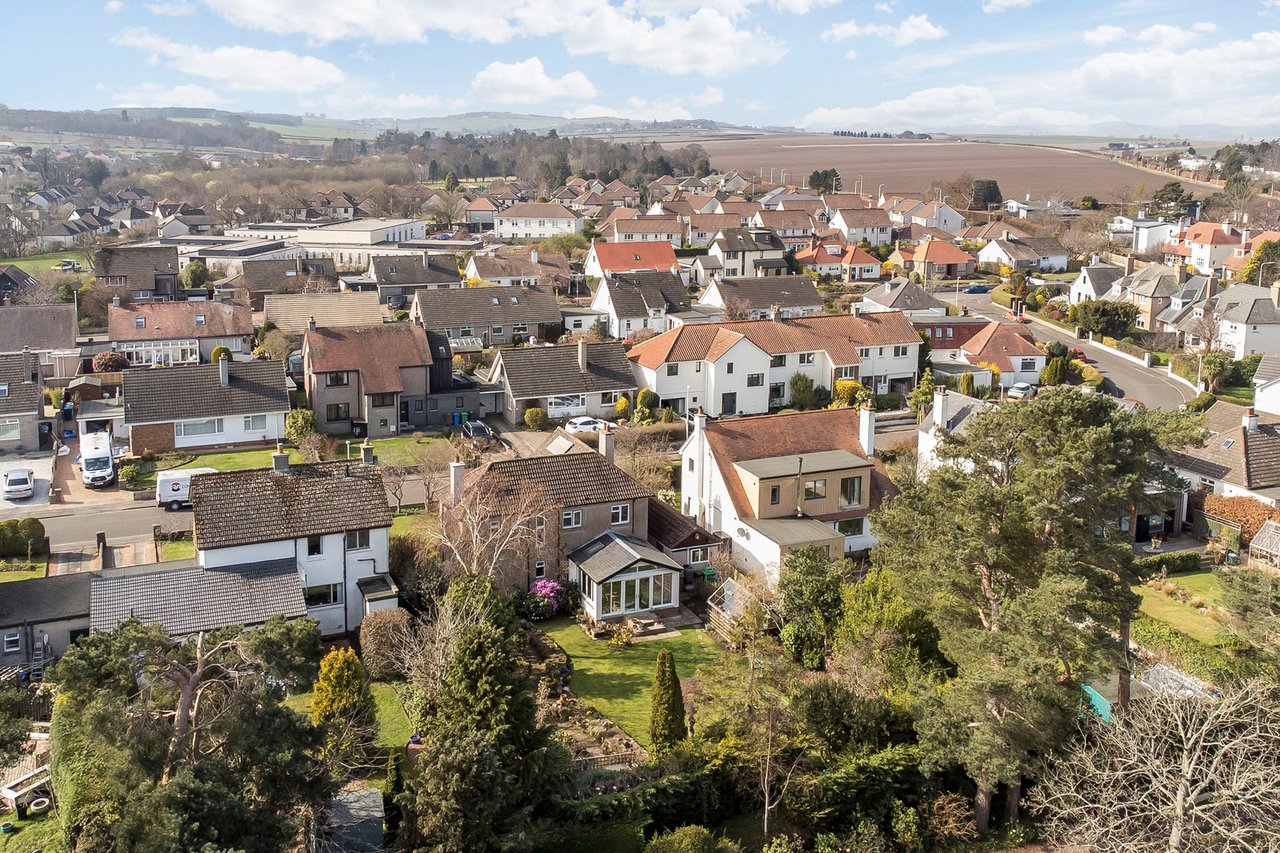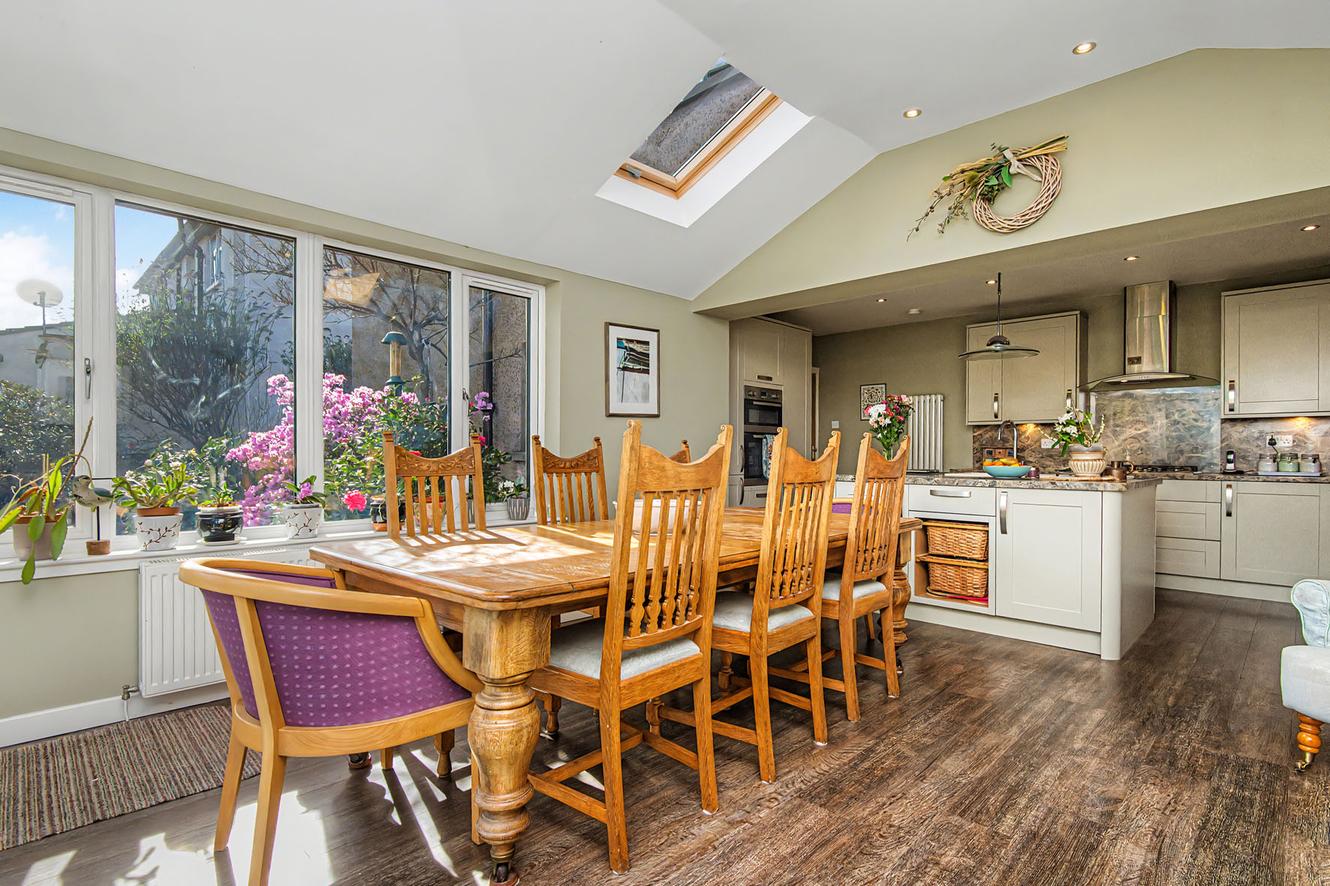 Set in a sought-after residential area of St Andrews, Eynhallow enjoys a peaceful position within easy reach of the town’s beaches, golf courses, and amenities, including primary and high schools a short walk away. The property is surrounded by thriving gardens, featuring well-kept lawns, a drying area, a summer house, a shed, and a greenhouse -creating a vibrant and versatile outdoor space ideal for relaxing, entertaining, or gardening enthusiasts. Inside, Eynhallow offers bright, adaptable living, including a dual- aspect living room with a log-burner, a sleek modern kitchen open to a skylit dining space with patio access, four flexible bedrooms, and a contemporary shower room, alongside a driveway, garage, and solar panels.