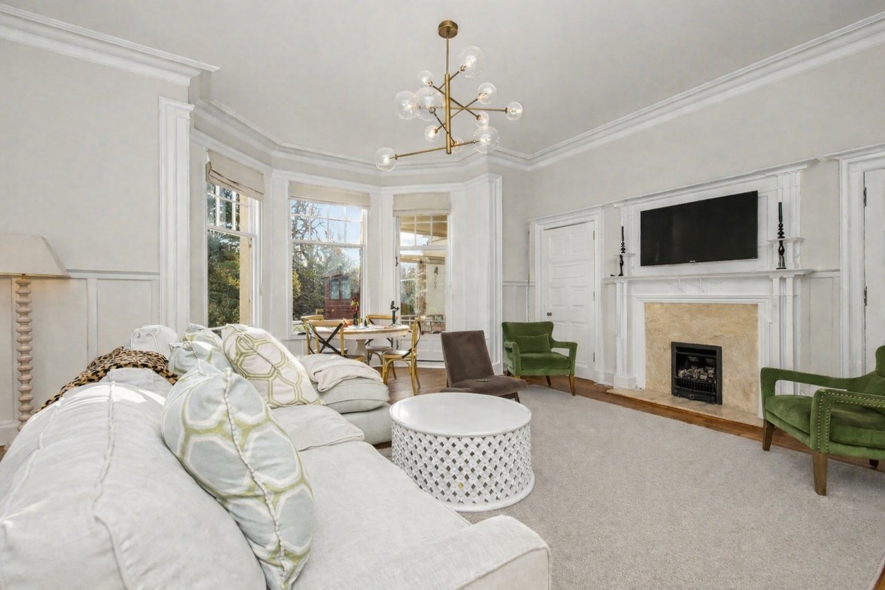 Large living/dining room with bay window
