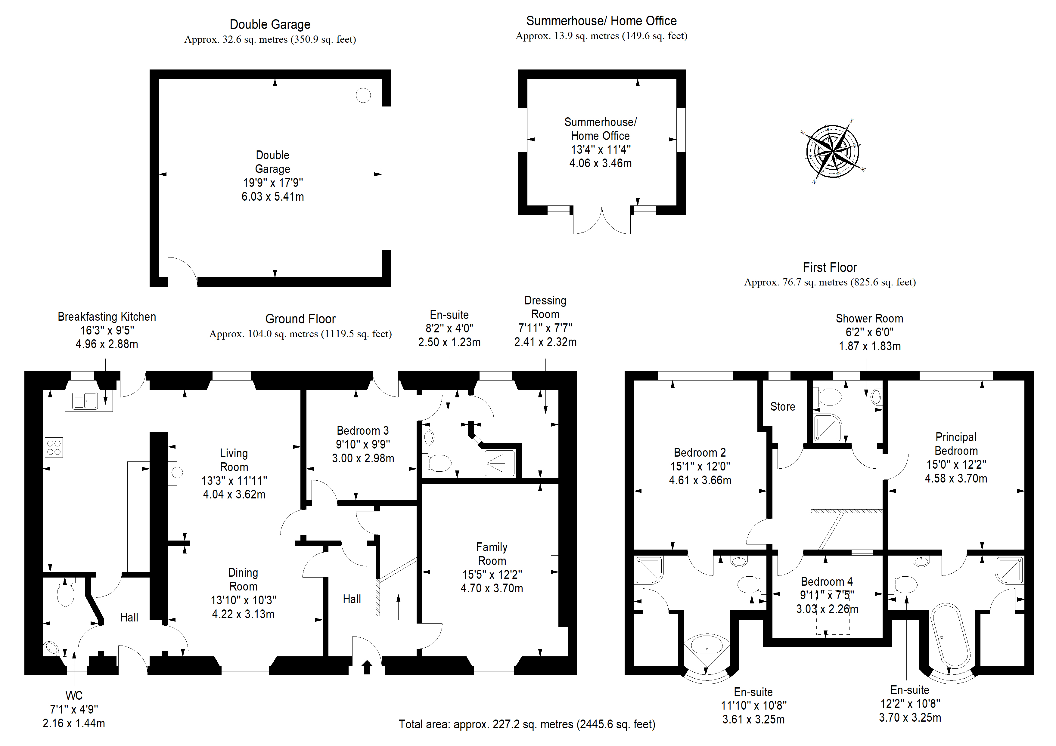 Upstairs, three generous bedrooms each offer built-in storage and private or shared access to luxury bathrooms, including two stylish en-suites and a family shower room. The principal suite is complete with a large dressing room, offering a true retreat.